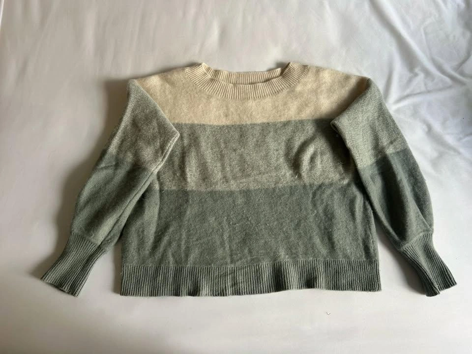 Gorgeous and ultra-soft Club Monaco boiled cashmere sweater in a serene Sea Glass colourway. Features a wide boatneck, relaxed silhouette, and chic tonal stripes. Warm, lightweight, and perfect for winter or transitional weather.