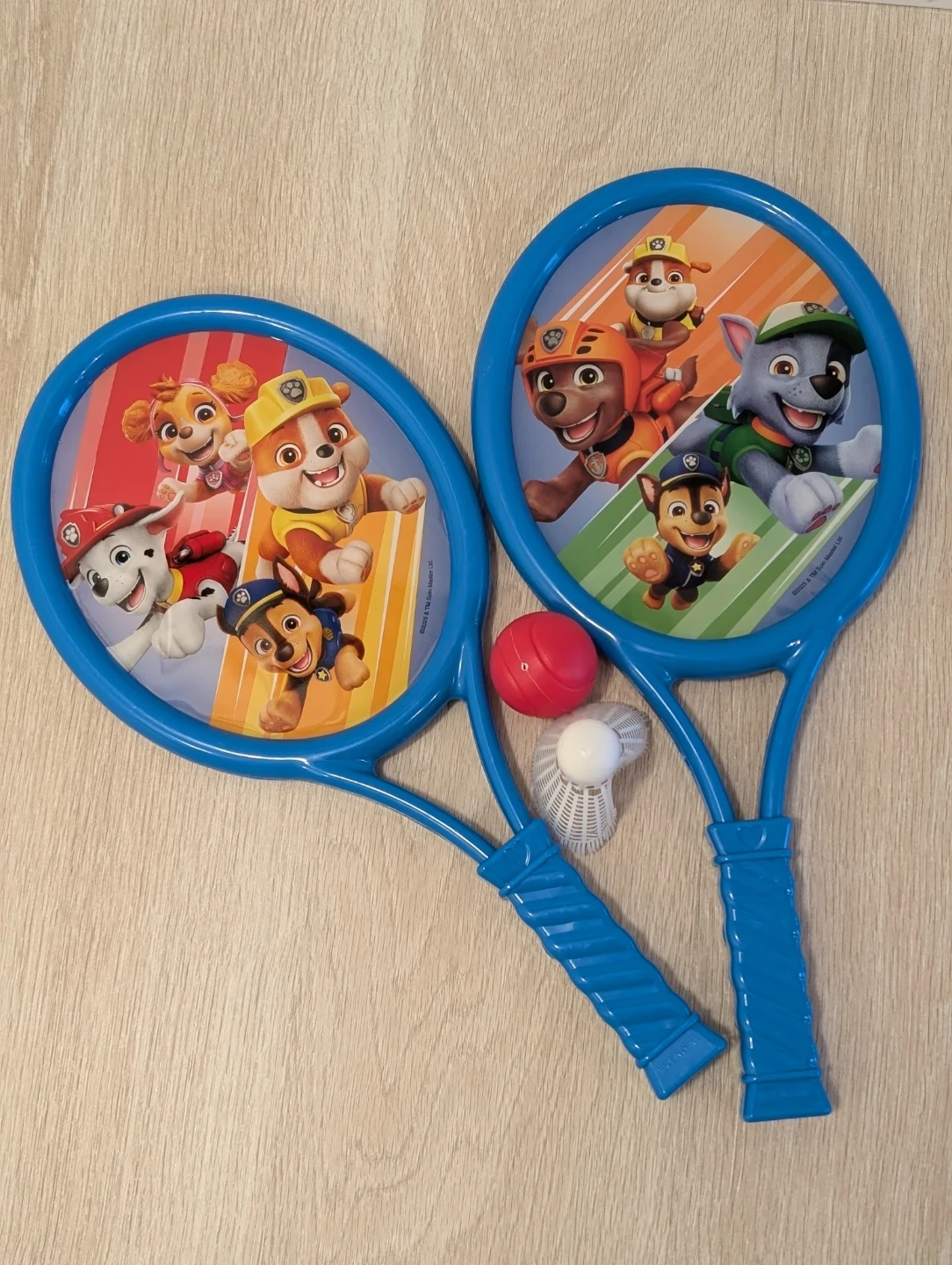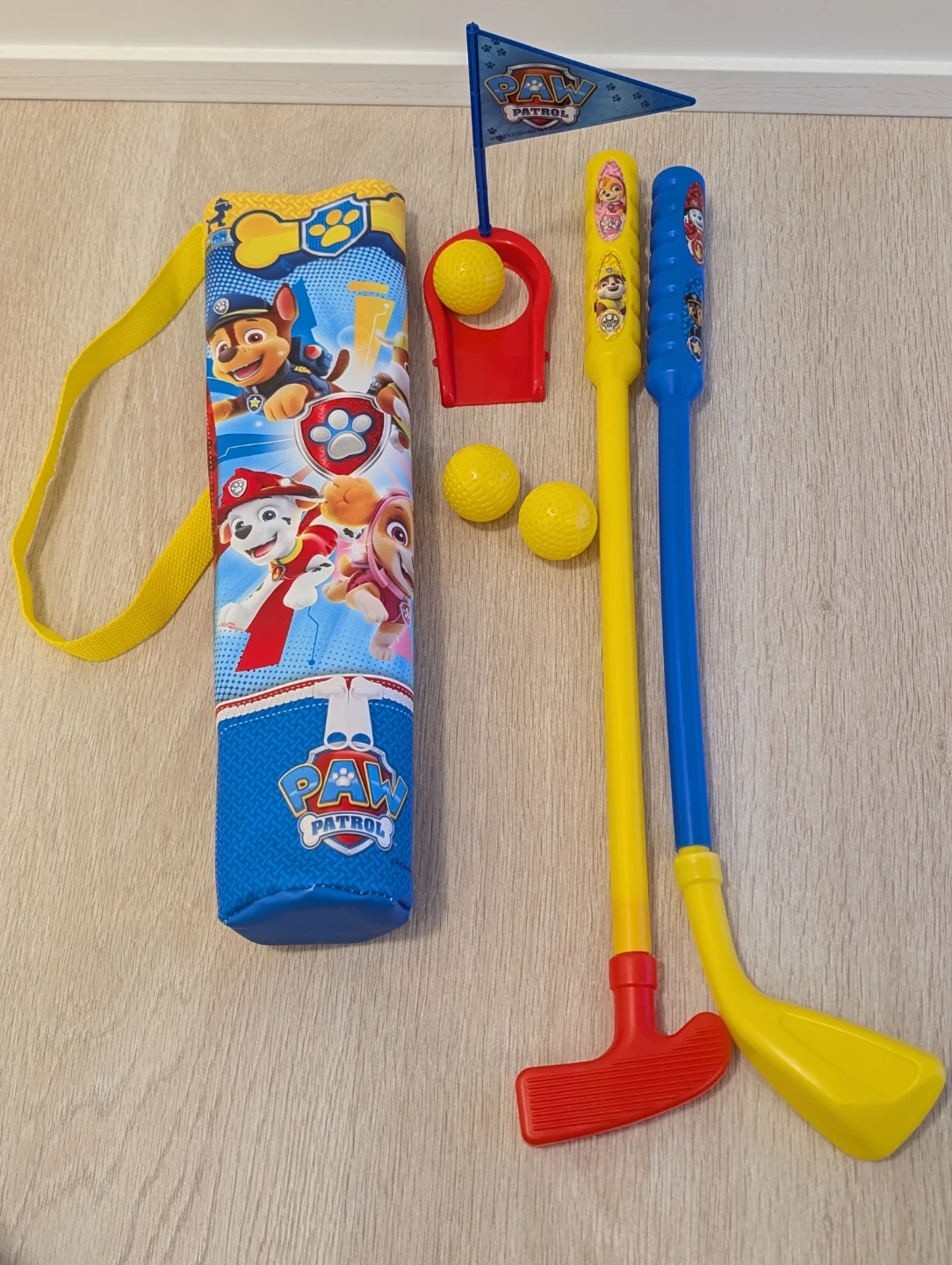Paw Patrol tennis and golf set. Includes two tennis rackets, a ball, and a shuttlecock; and a birdie, two golf clubs, three golf balls, a flag, and a carrying case. In great condition. Added a backpack.