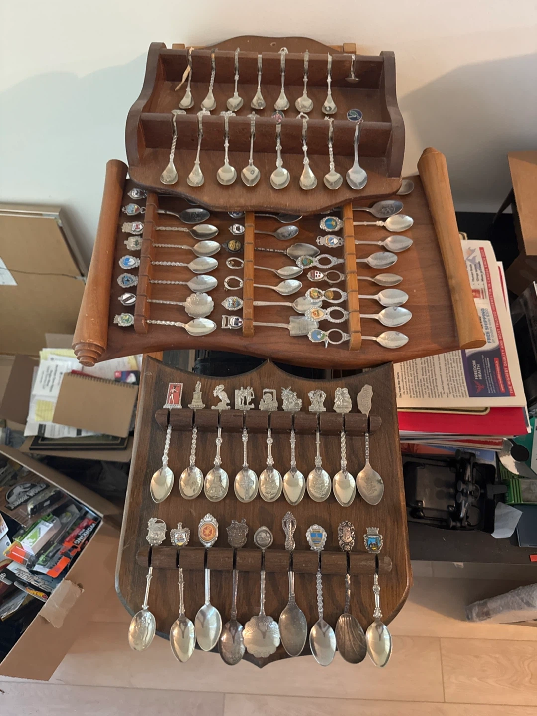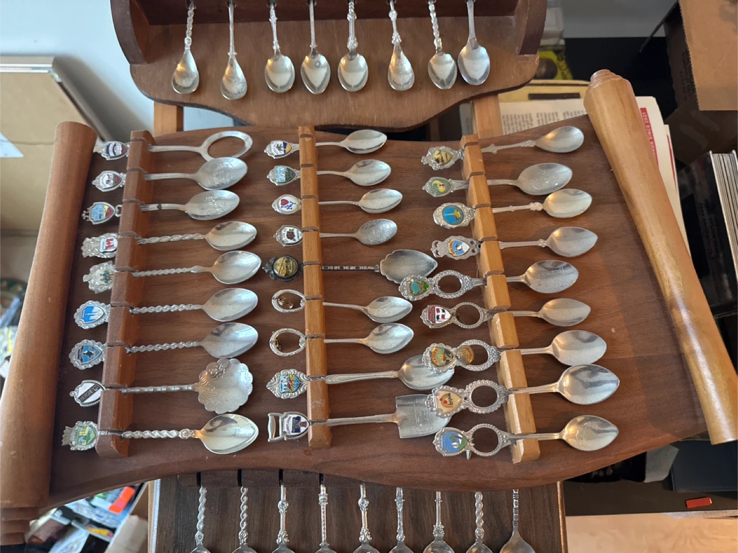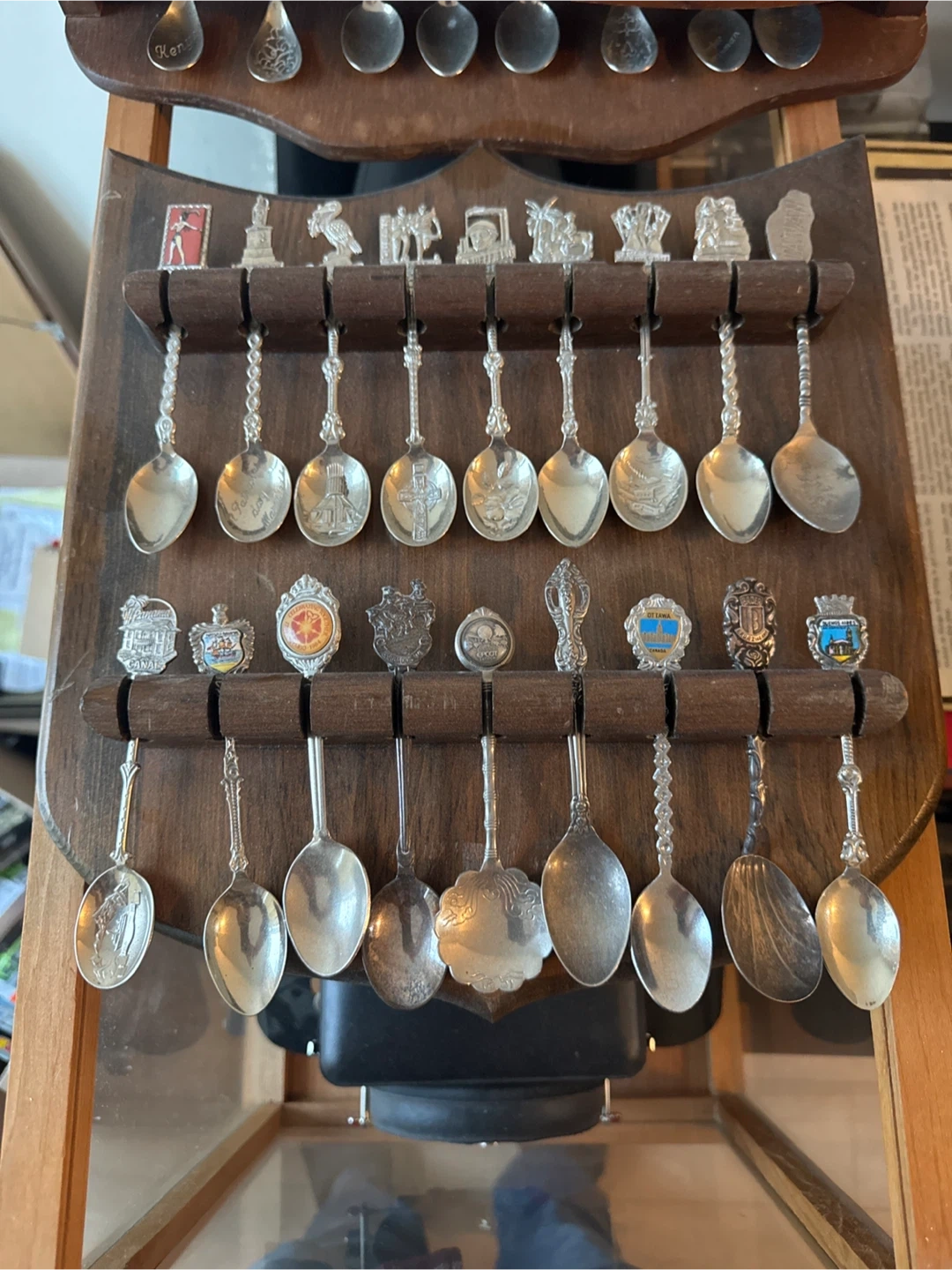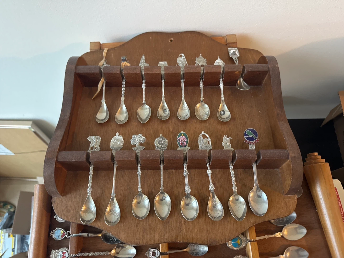Selling a collection of vintage souvenir spoons. They come in a wooden display case. Some are silver plated. Made in Great Britain and Holland. Great for collectors!