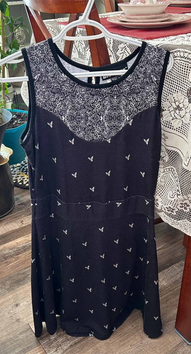 This is a cute black sleeveless dress with a unique pattern on the top. It's in great condition and perfect for summer!