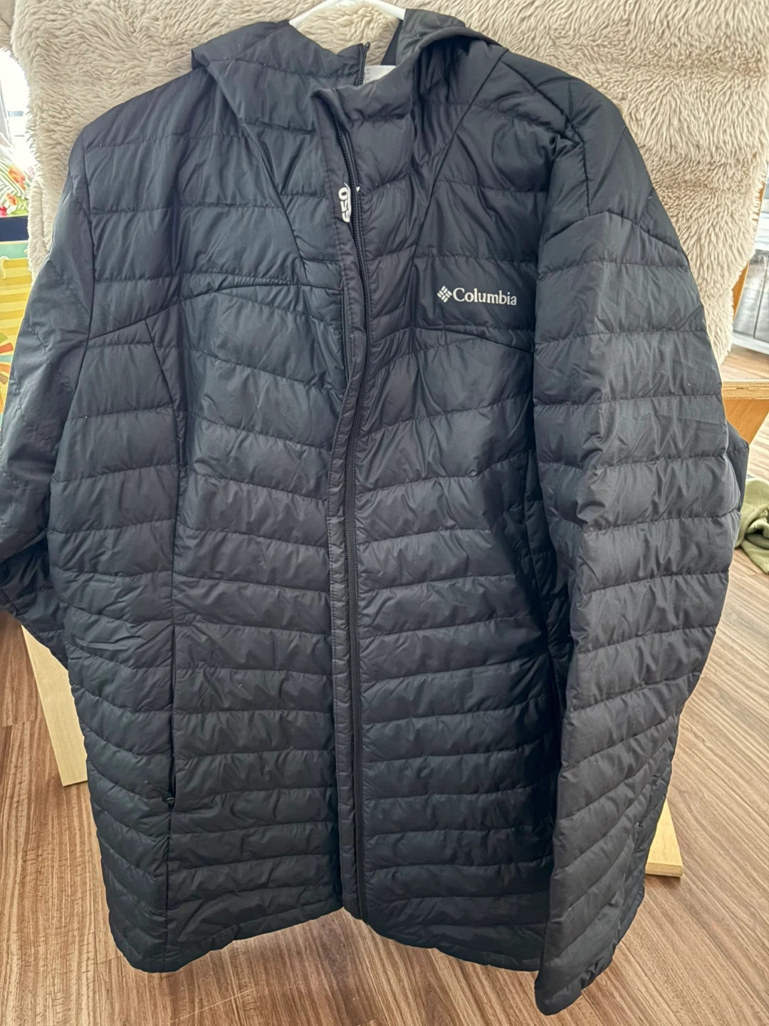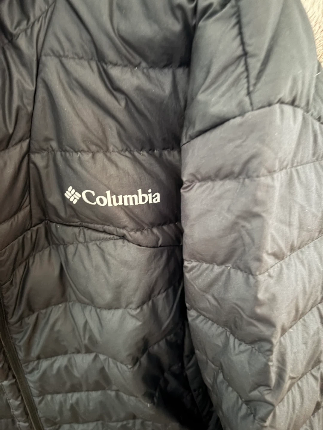 Selling a Columbia black puffer jacket in great condition! It's lightweight and perfect for layering. The jacket features a full zip and the Columbia logo on the chest. Feel free to reach out if you have any questions!