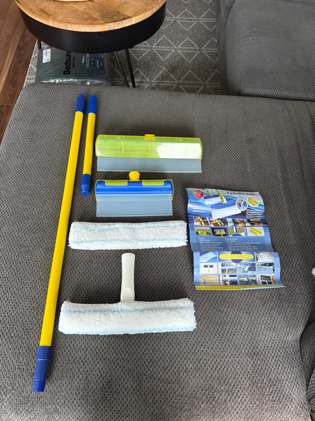 Selling an AquaBlade window cleaning kit. It comes with the pole, squeegee attachments, and microfiber cloths.