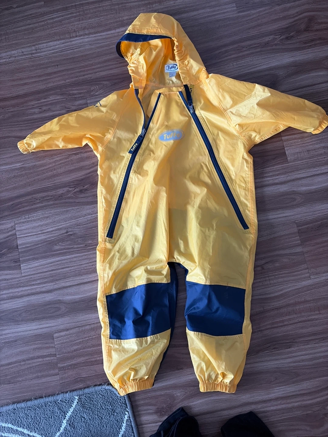 Keep your little one dry and happy with this Tuffo Muddy Buddy rainsuit! It's in great shape and ready for puddle jumping. The size is 2T and the colour is yellow with navy accents