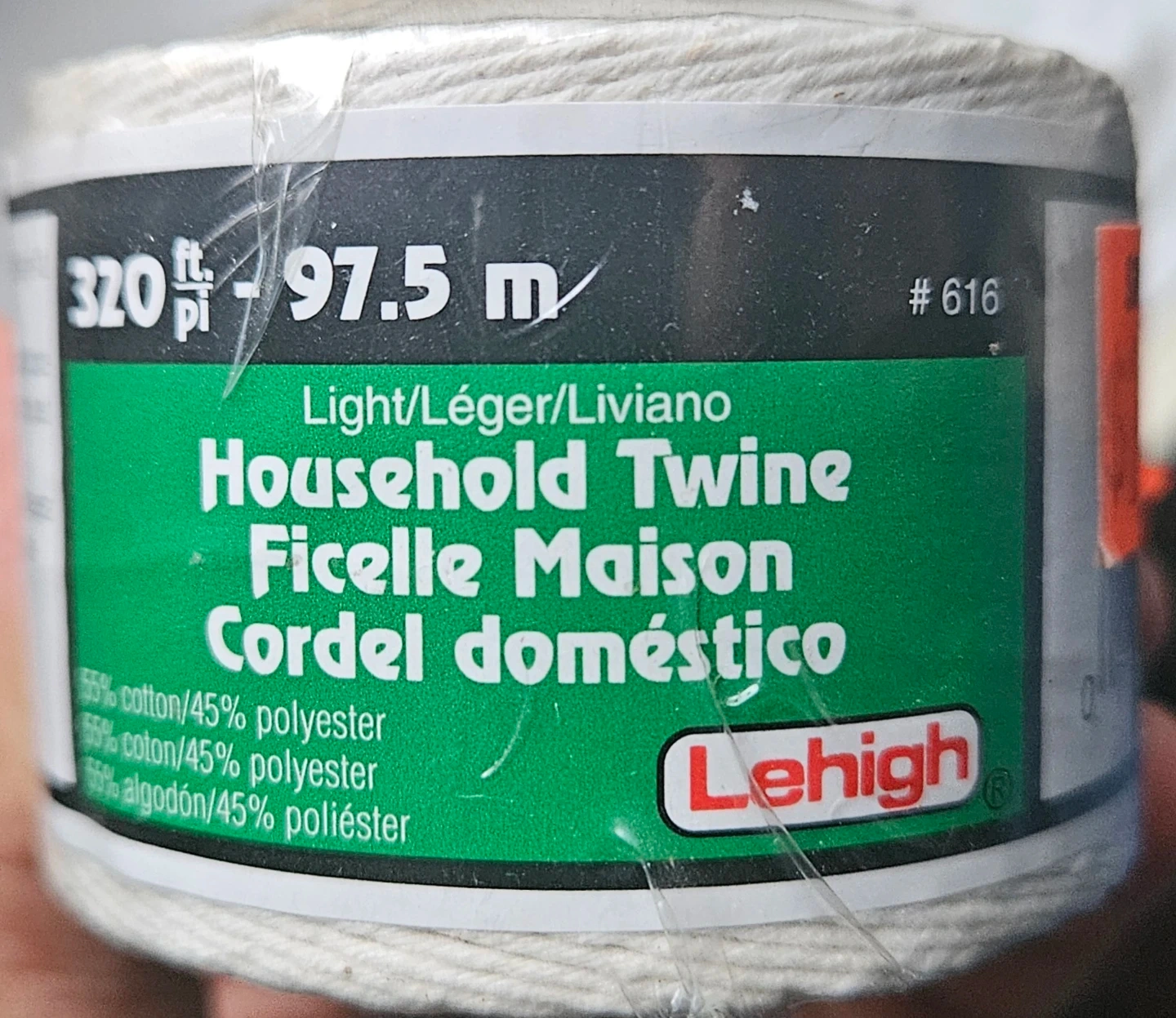 Selling a roll of Lehigh Household Twine. It's 320 feet long (97.5 meters). Made of 55% cotton and 45% polyester.