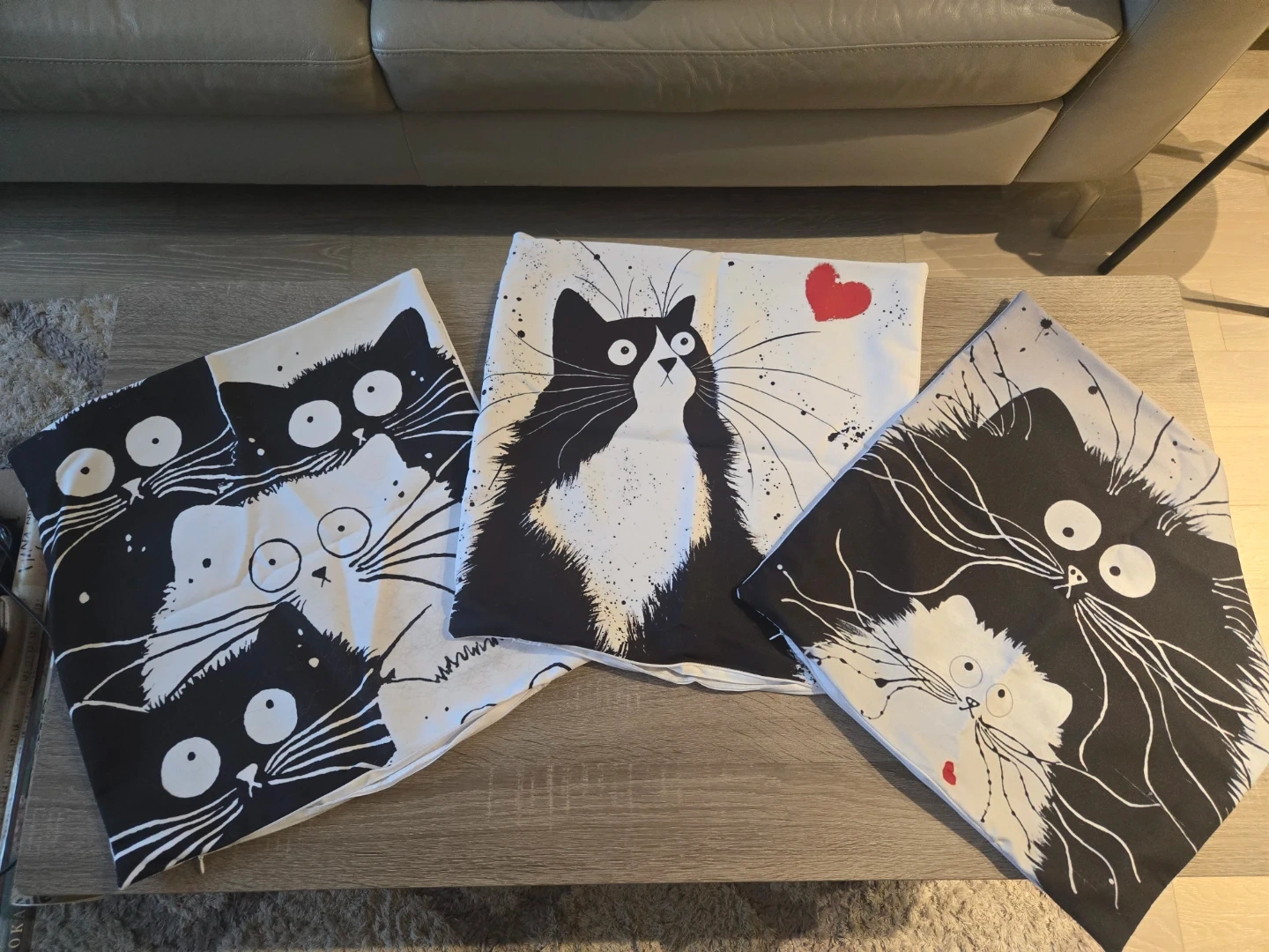 Here's a set of three pillow covers featuring adorable cat prints! They're in a black and white colour scheme and would add a fun touch to any room