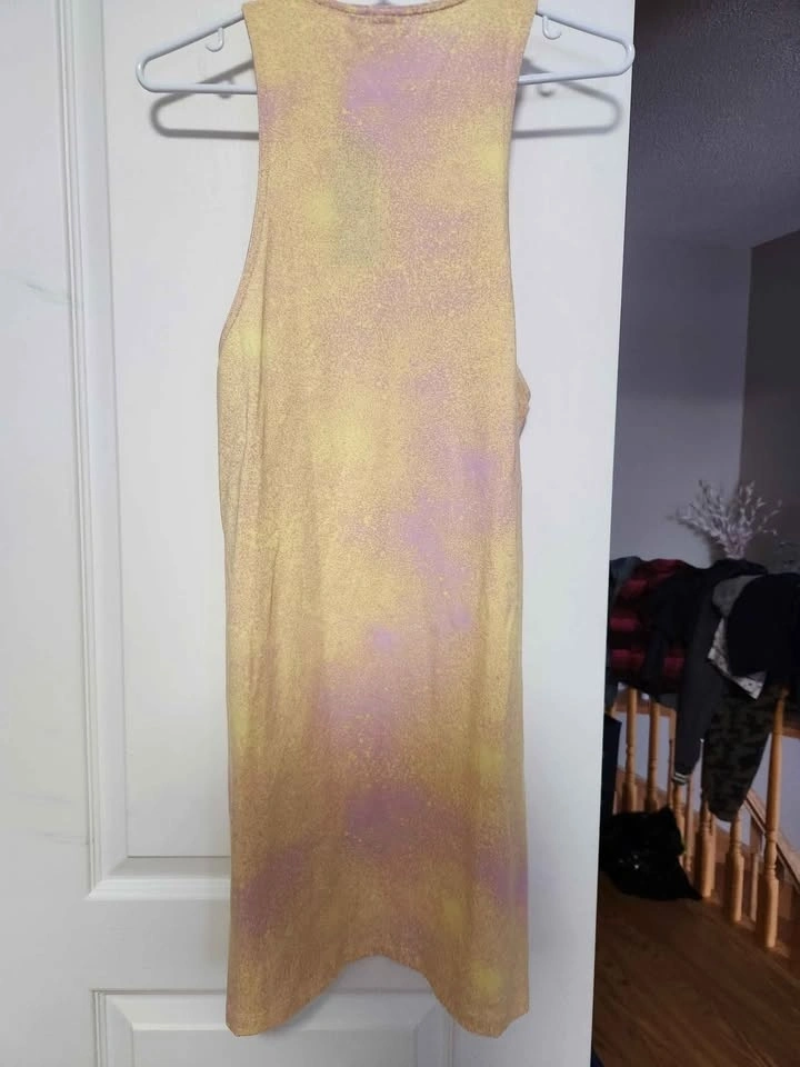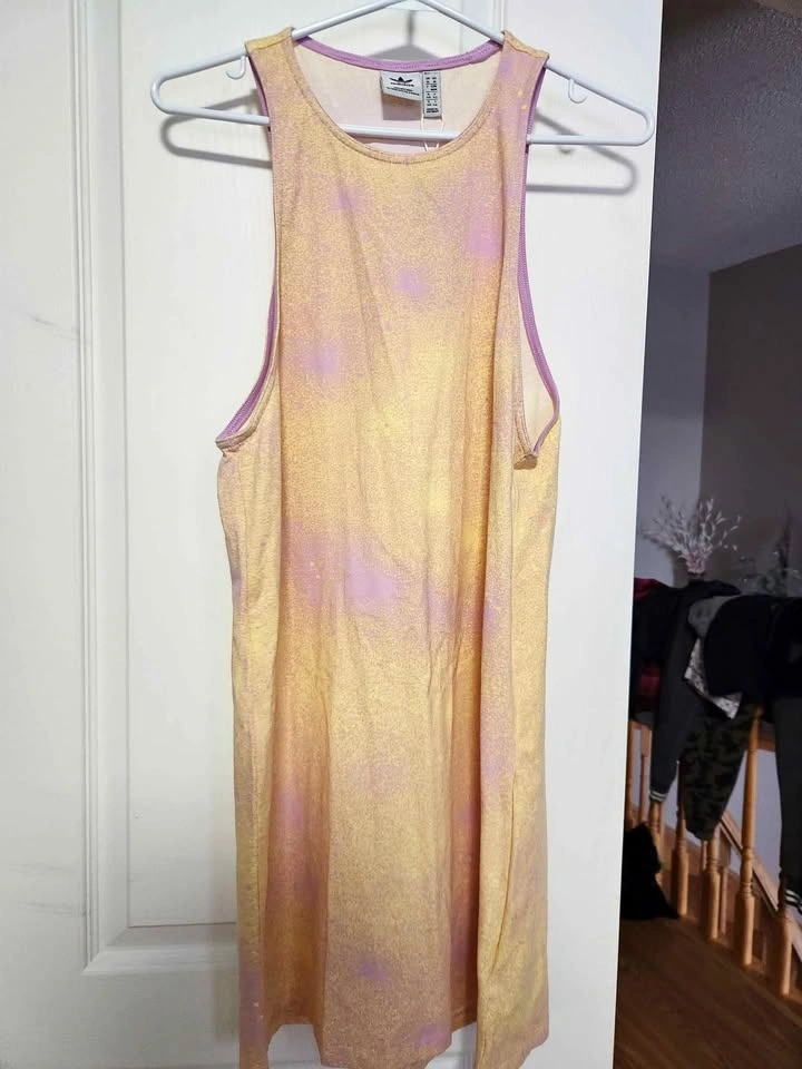 Adidas sleeveless athletic tank in a soft multicolor pastel tone. Lightweight and breathable, great for workouts, gym sessions, yoga, or casual athleisure wear. Comfortable relaxed fit with scoop neckline.