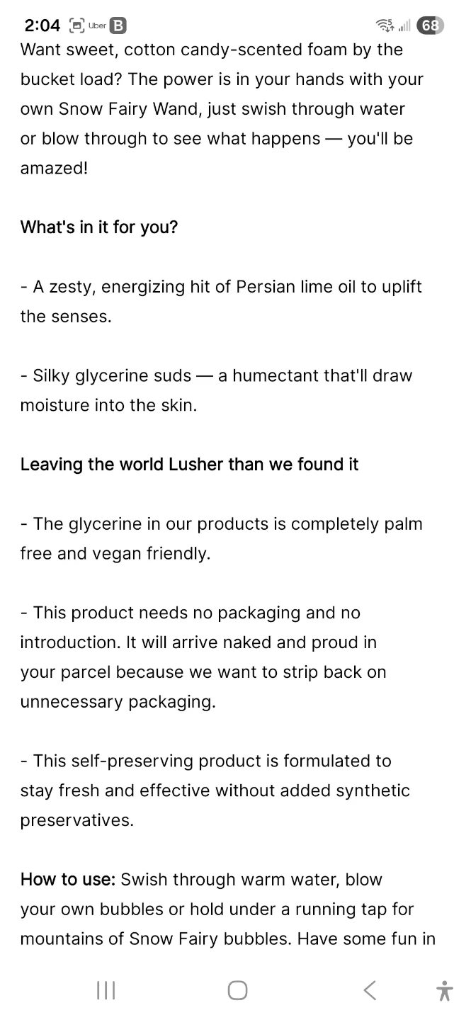 Want sweet, cotton candy-scented foam? The power is in your hands with your own Snow Fairy Wand, just swish through water or blow through to see what happens—you'll be amazed! It contains a zesty, energizing hit of Persian lime oil to uplift the senses, and silky glycerine suds—a humectant that'll draw moisture into the skin
