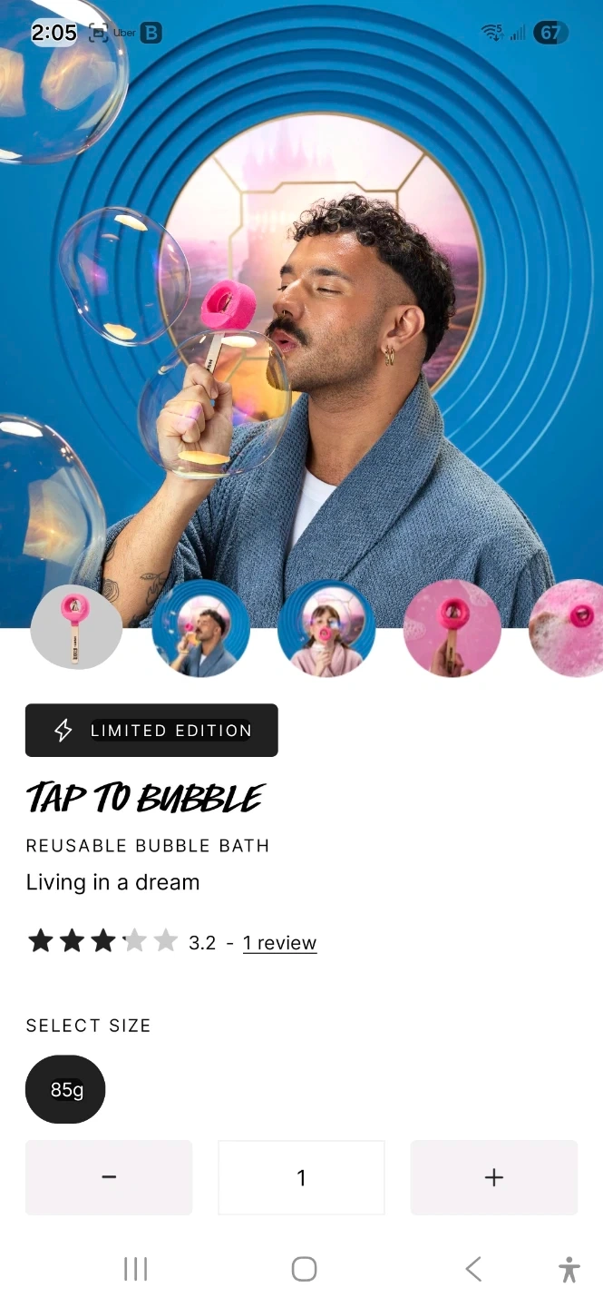 Selling a Lush Tap to Bubble reusable bubble bath! It's the limited edition version and weighs 85g. It's designed to conjure up cascades of dazzling bubbles with a juicy lime and almond essential oil bubblegum aroma. Made in Canada