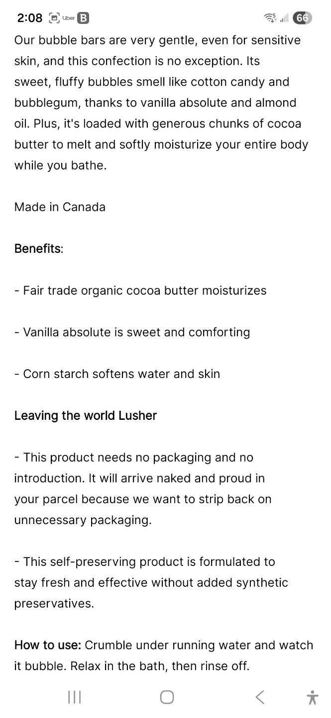Our bubble bars are very gentle, even for sensitive skin, and this confection is no exception! It's sweet, fluffy bubbles smell like cotton candy and bubblegum, thanks to vanilla absolute and almond oil. Plus, it's loaded with generous chunks of cocoa butter to melt and softly moisturize your entire body while you bathe. This product needs no packaging and no introduction. It will arrive naked and proud in your parcel because we want to strip back on unnecessary packaging. This self-preserving product is formulated to stay fresh and effective without added synthetic preservatives. Originally bought for $8.50!