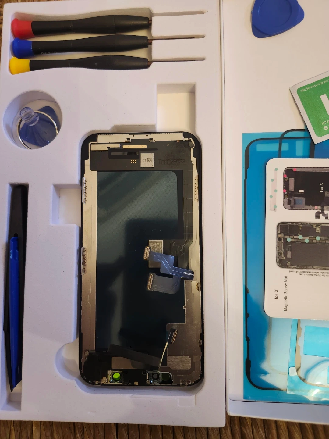 Selling a brand new iPhone X screen replacement kit! It comes with everything you need to replace your screen at home. Included are the screen, tools, and instructions in the original box and tempered glass