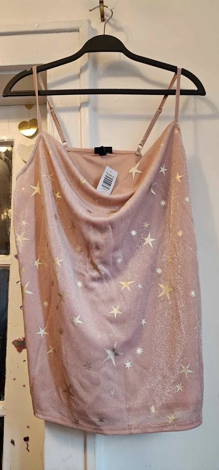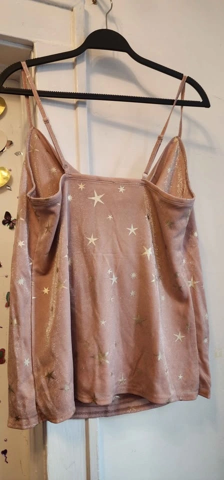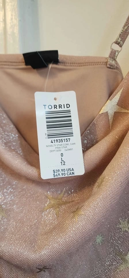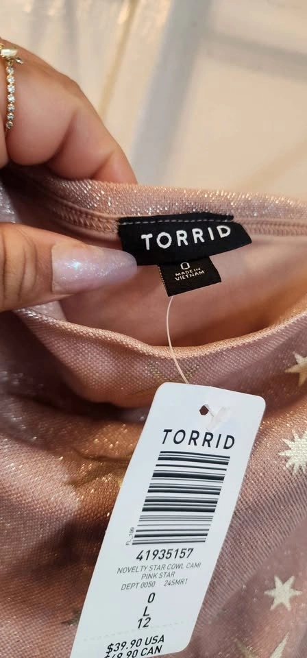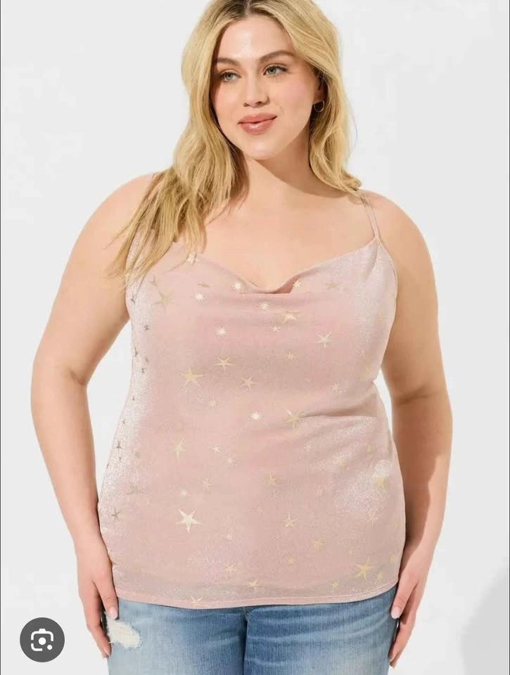 Torrid Shimmer Star Cowl Neck Cami Tank available in pink or rose gold star accents.