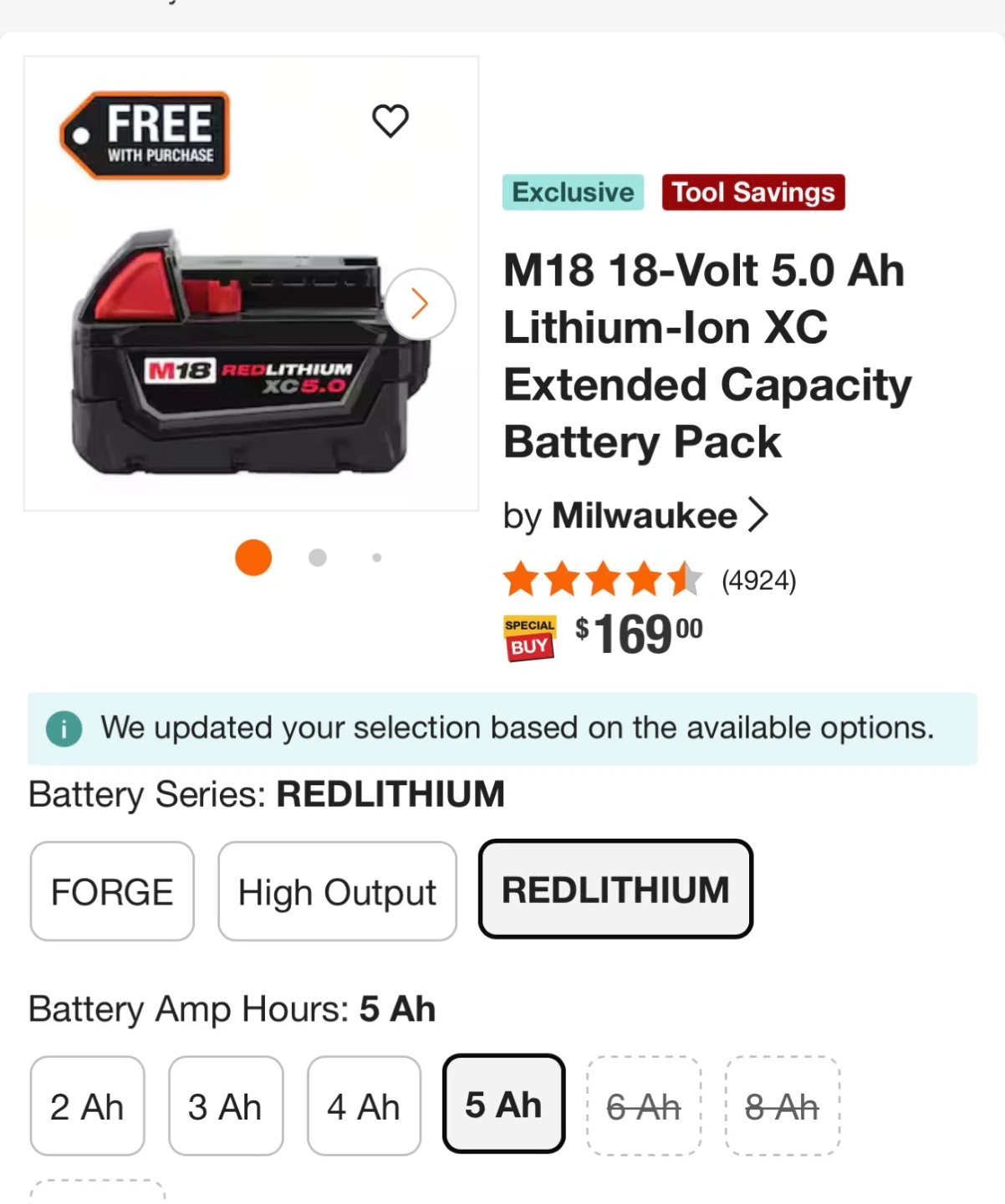 Selling a Milwaukee M18 18-Volt 5.0 Ah Lithium-Ion XC Extended Capacity Battery Pack! This is from the REDLITHIUM battery series and has 5 Ah battery amp hours. Originally priced at $169