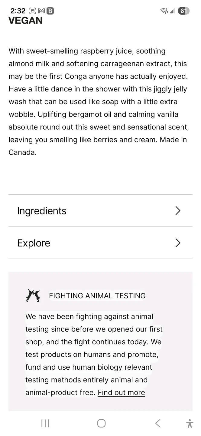 Selling a CONGA Shower Jelly, 100g size! This shower jelly has a sweet-smelling raspberry juice, soothing almond milk and softening carrageenan extract. It can be used like soap with a little extra wobble. Uplifting bergamot oil and calming vanilla absolute round out this sweet and sensational scent, leaving you smelling like berries and cream. Made in Canada