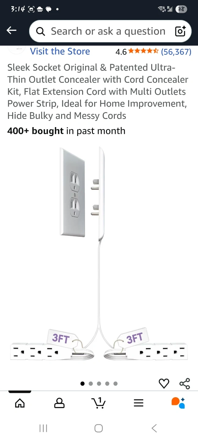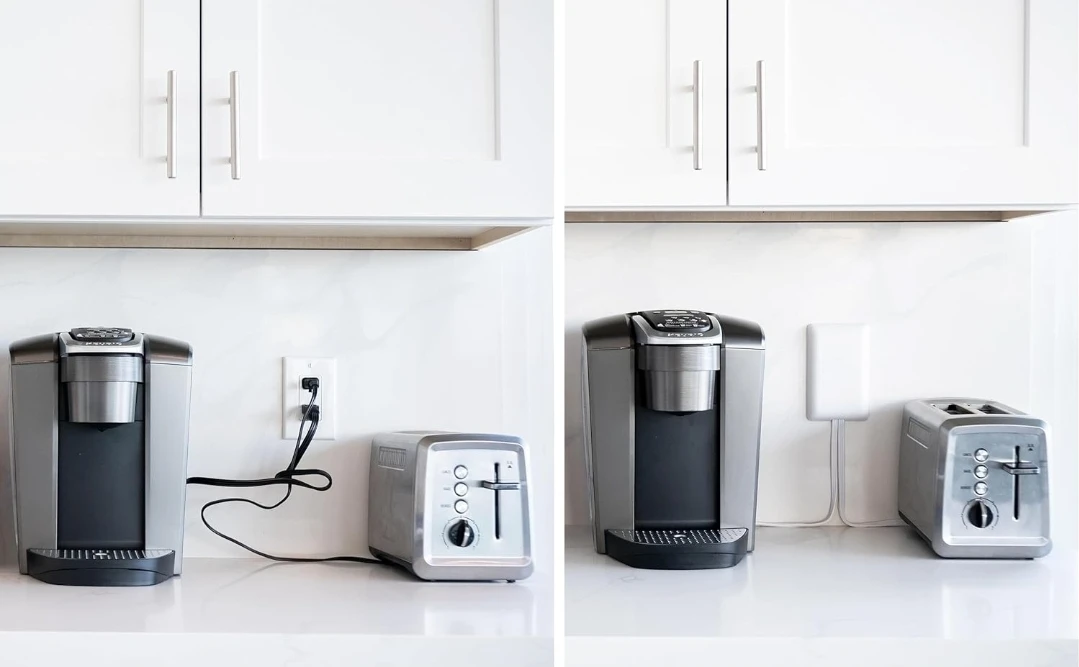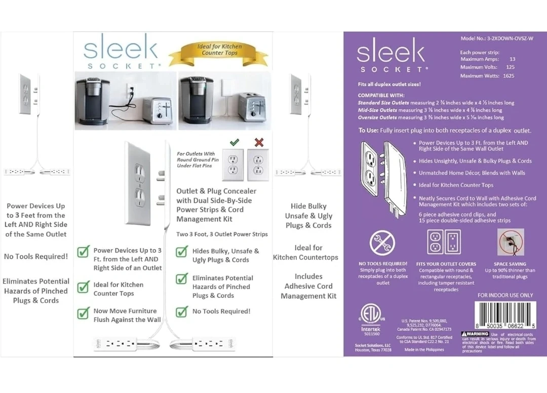 Declutter your space with this Sleek Socket outlet concealer and cord management kit! It's designed to hide bulky, unsafe, and ugly plugs and cords, blending seamlessly with your decor. Ideal for kitchen countertops and other areas where you want a cleaner look. This kit includes adhesive cord management clips and can power devices up to 3 ft from the left and right side of the same wall outlet