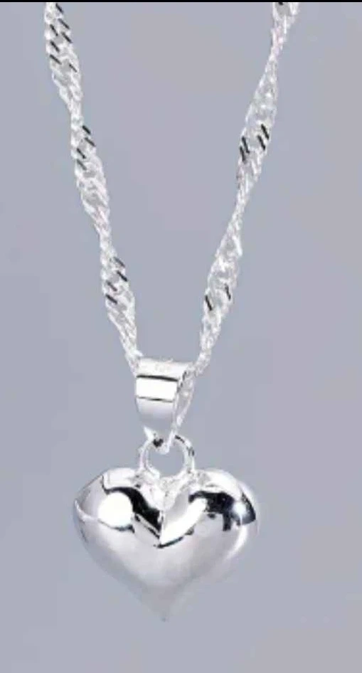 This is a silver heart pendant necklace. The chain length is approximately 45-50cm (15.7 - 1.96 inches). The pendant is about 1cm (0.39 inches) in size. The necklace weighs 2.5g (0.08oz).