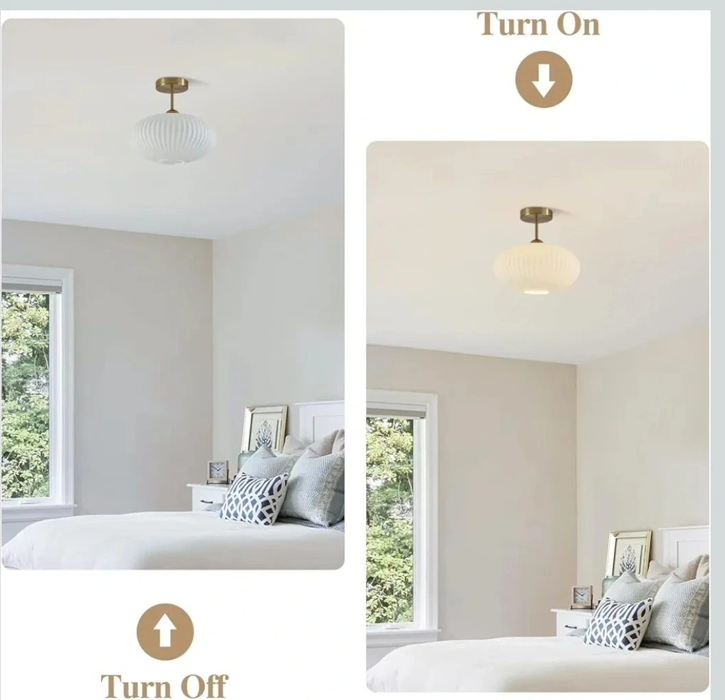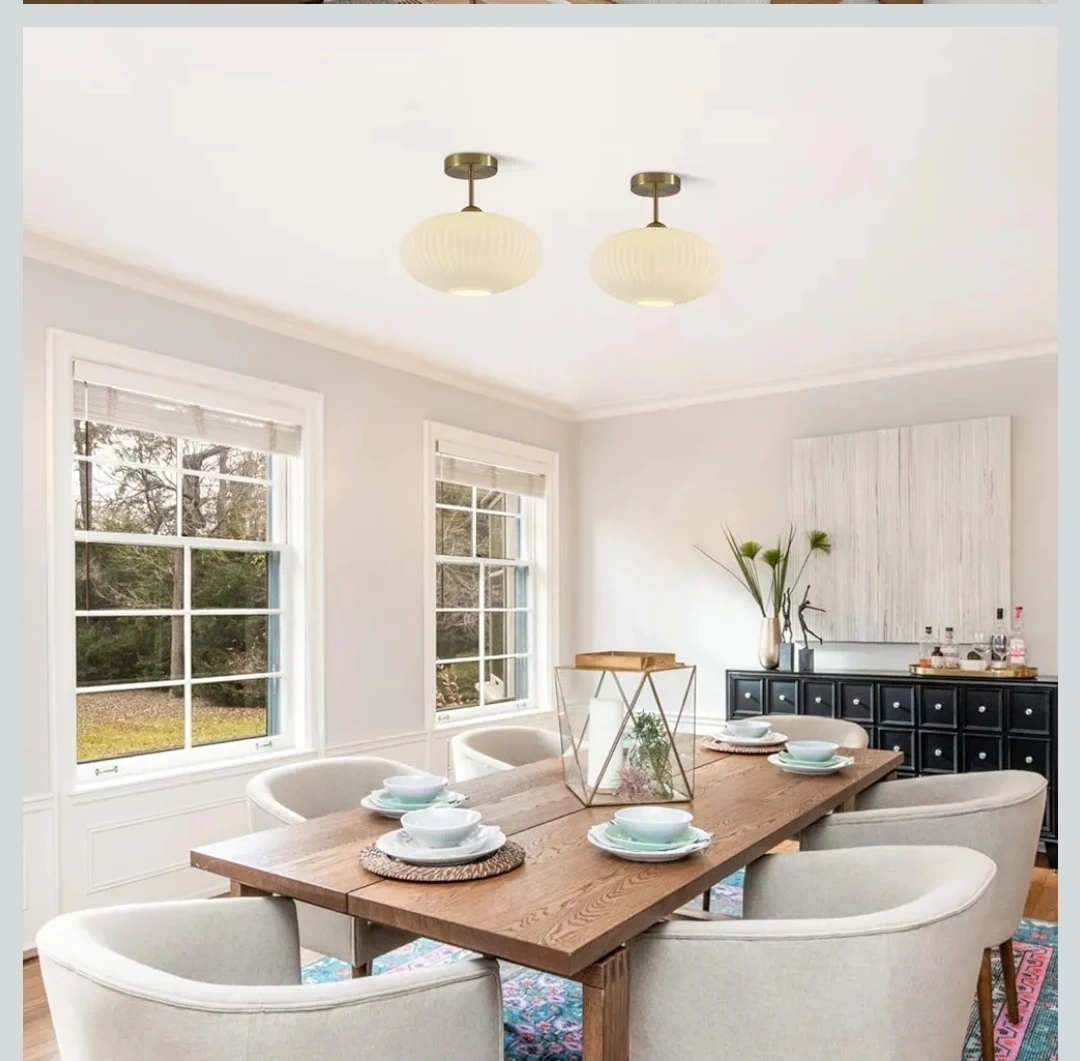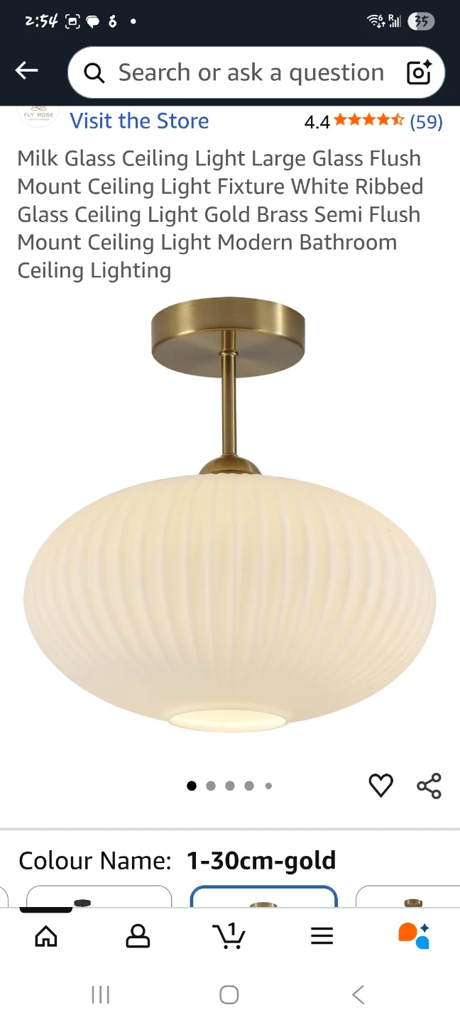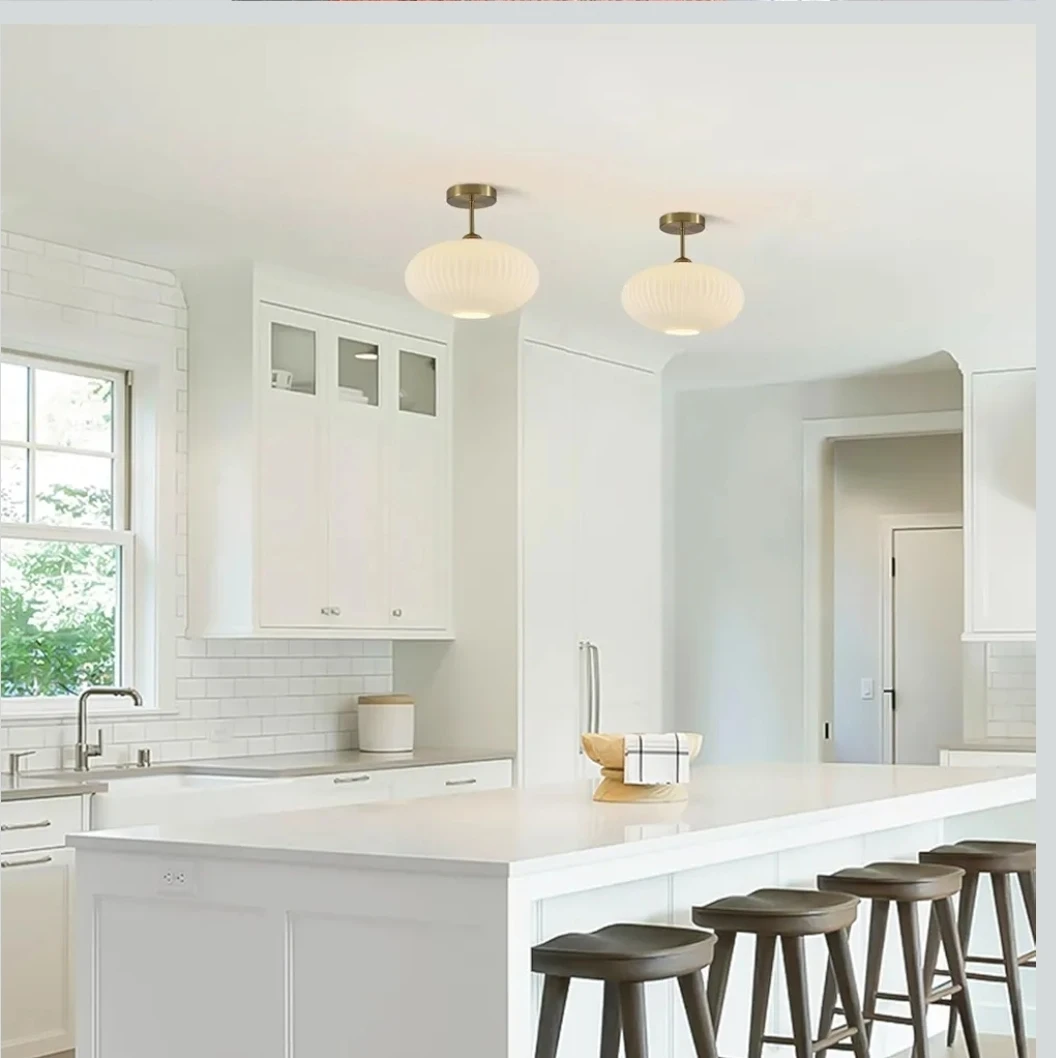 Selling a milk glass ceiling light fixture in white and gold. It's a large glass flush mount, perfect for modern bathrooms or any room needing a touch of elegance.