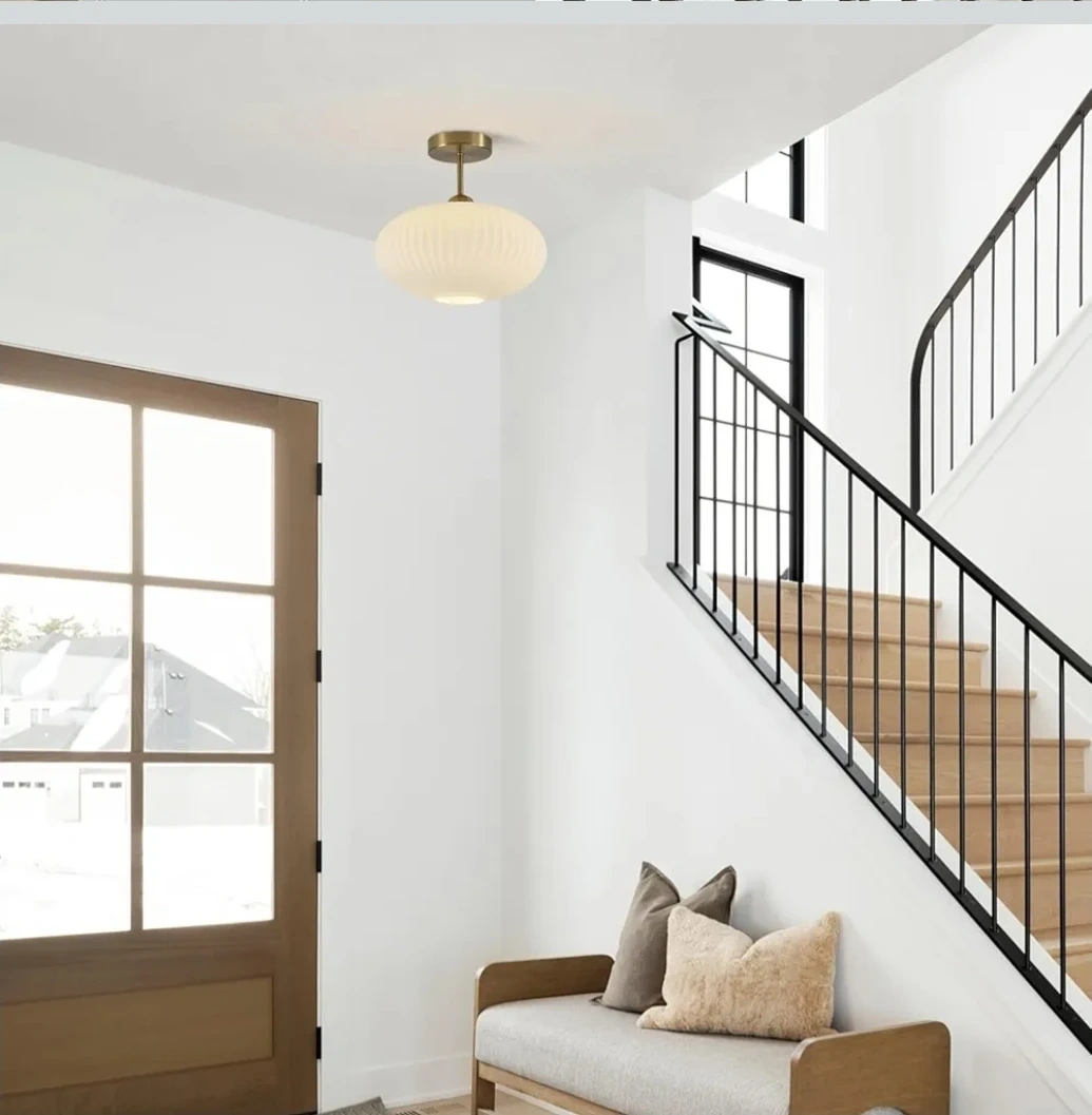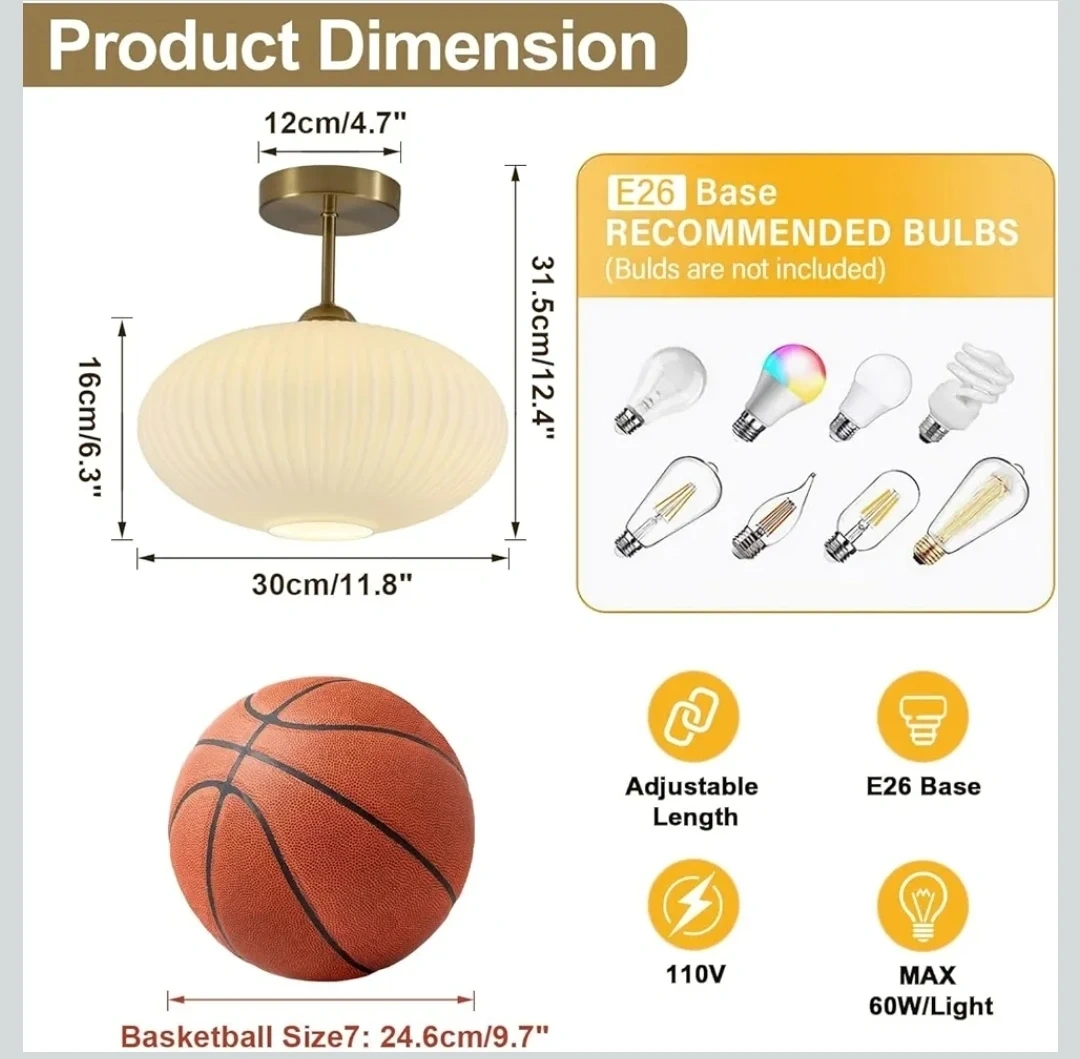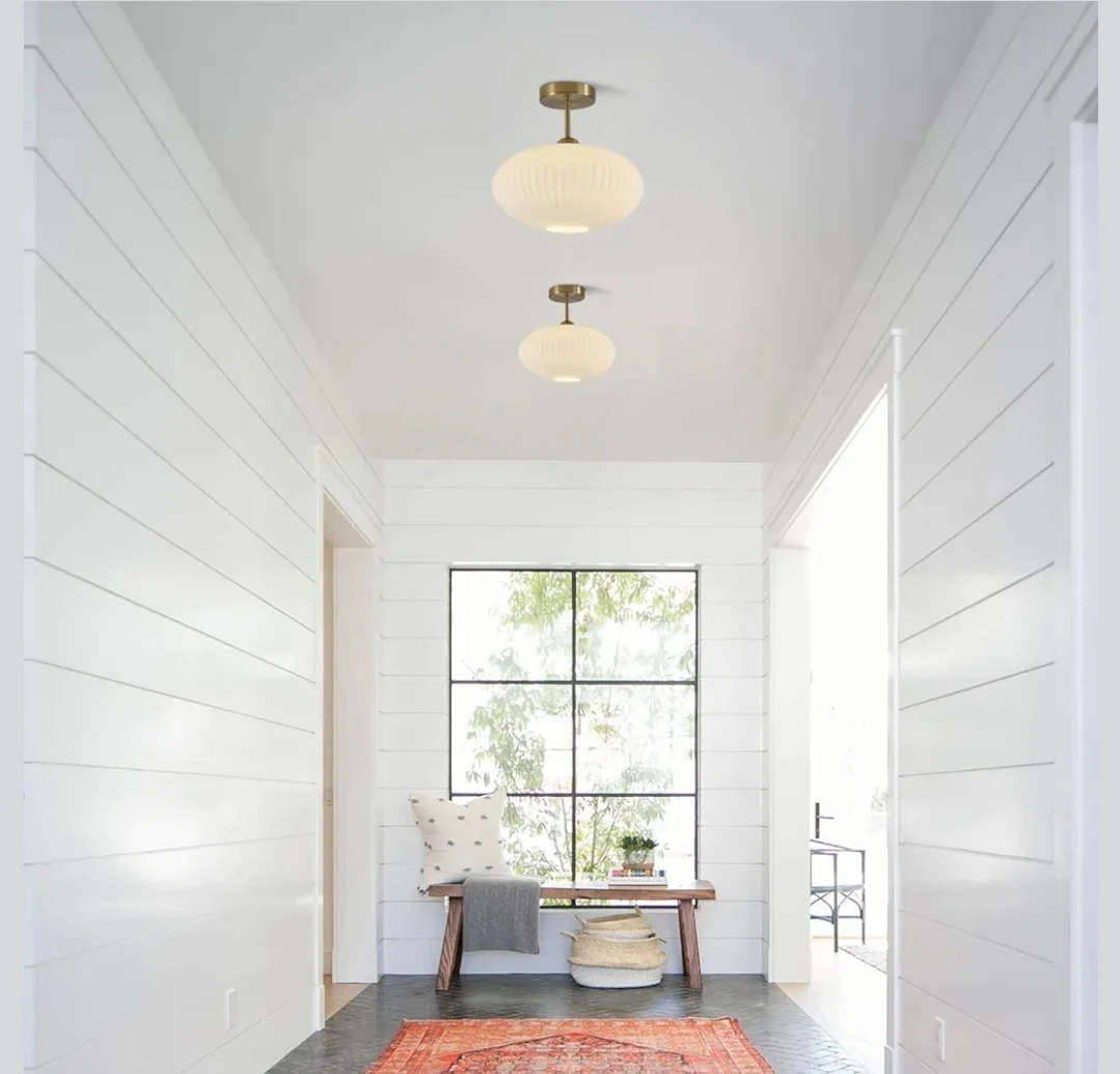 Selling a milk glass ceiling light fixture in white and gold. It's a large glass flush mount, perfect for modern bathrooms or any room needing a touch of elegance.