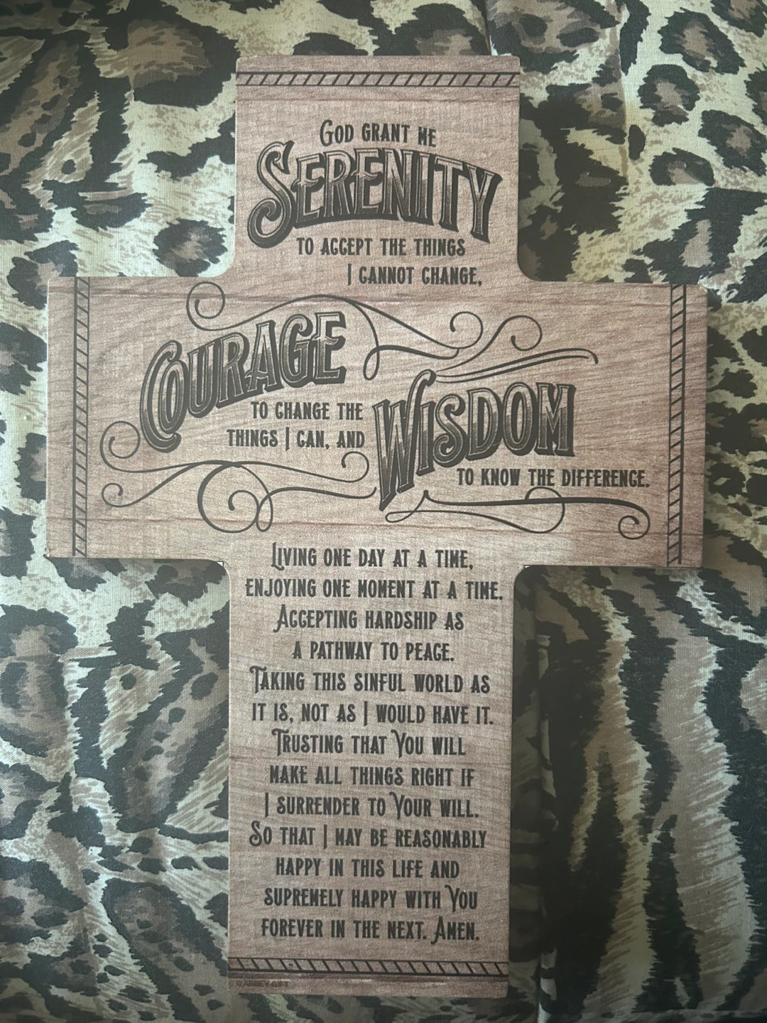 Selling a wooden cross featuring the Serenity Prayer. It's in great condition and would make a lovely addition to any home. The cross has a stand on the back, so it can be displayed on a shelf or table.