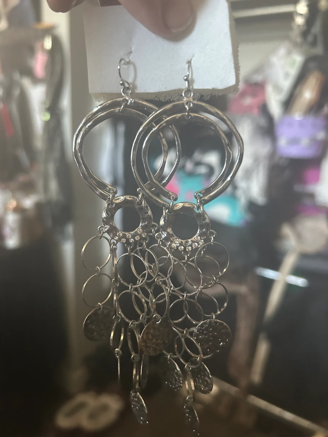 Selling a cute pair of silver dangle earrings. They have a unique design with multiple circles and small coin-like details hanging down. These earrings would be a fun addition to any outfit!