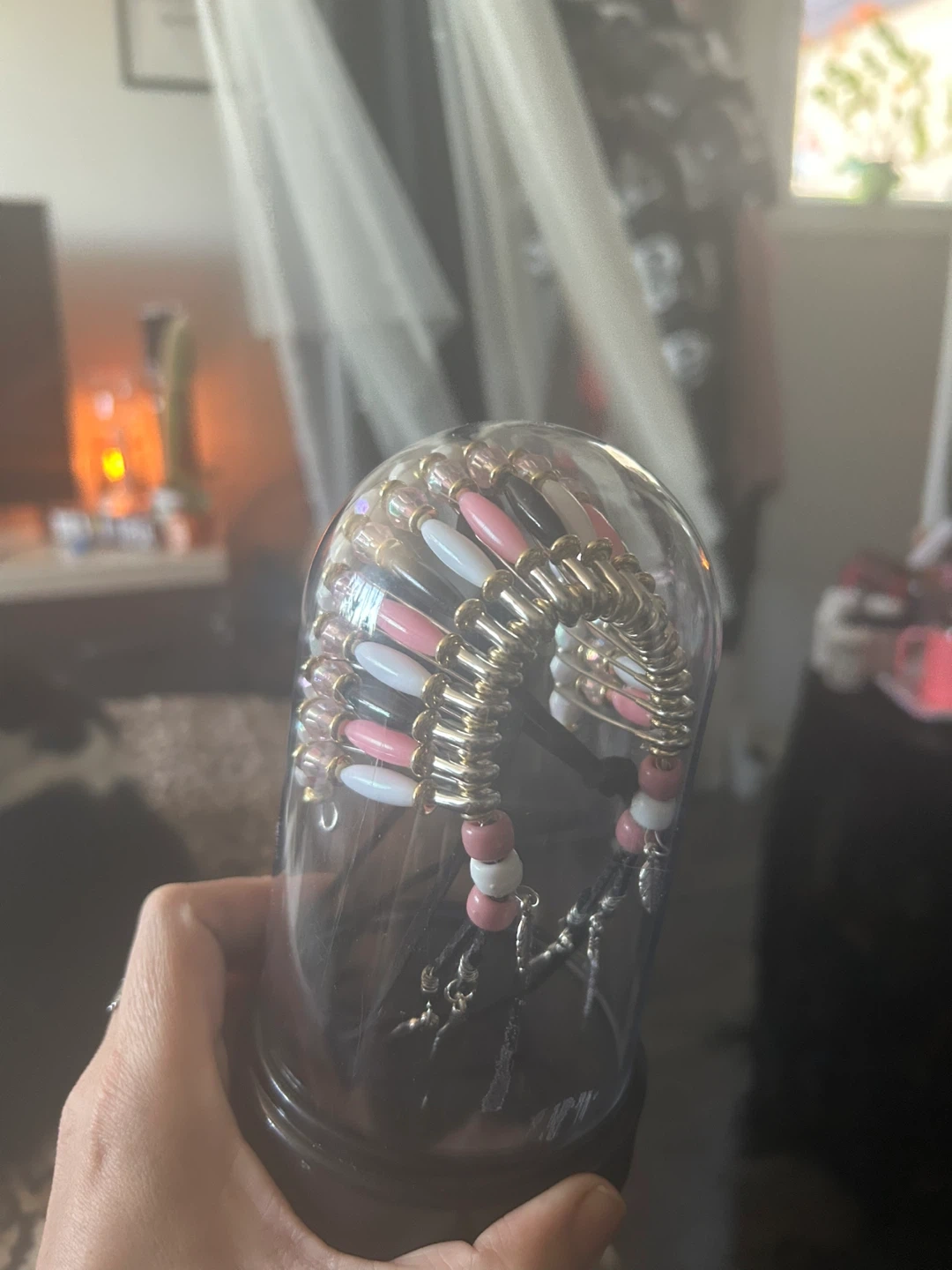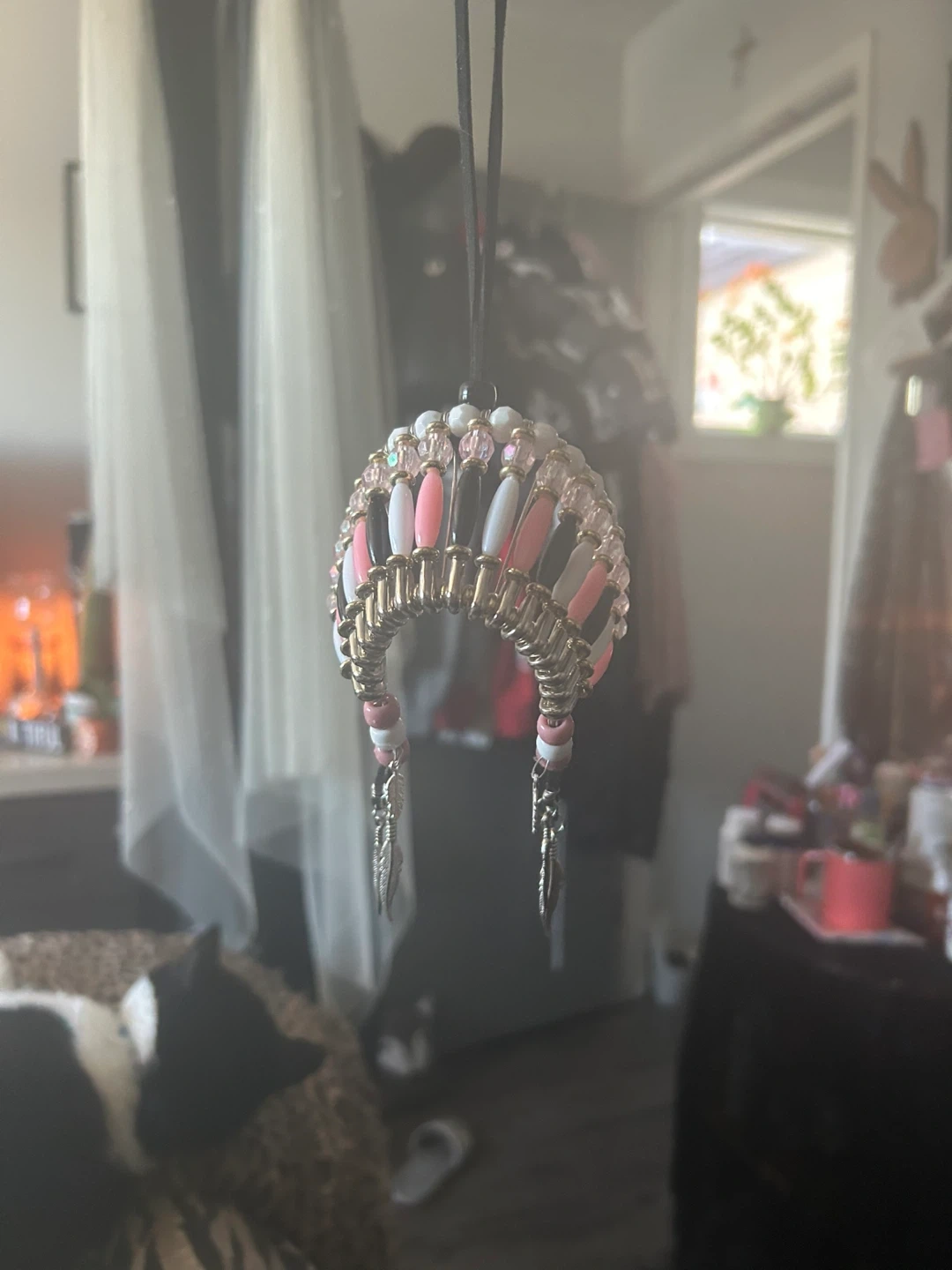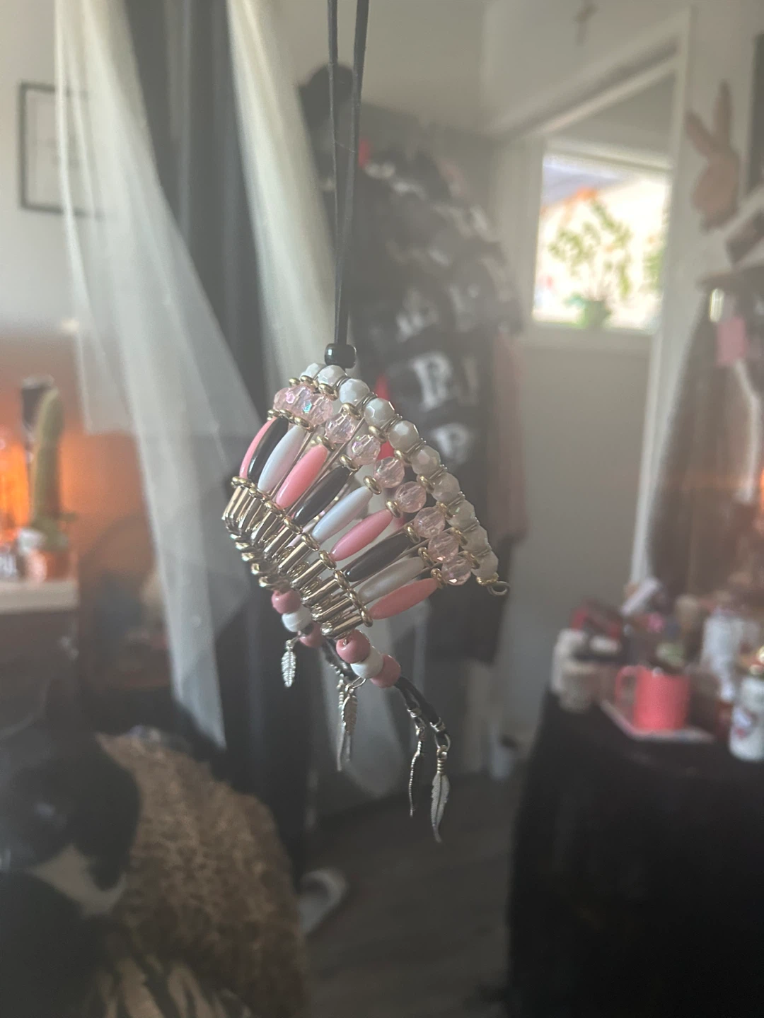 Selling a cute beaded headdress ornament! It features pink, white, and gold beads, with small feather charms hanging from the bottom. It's in great condition and would be a lovely addition to any room or car!
