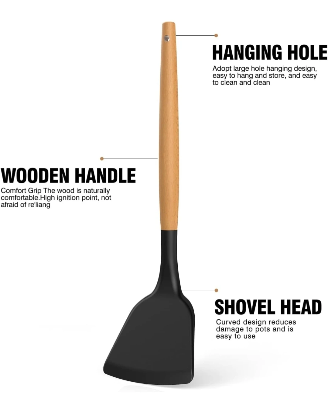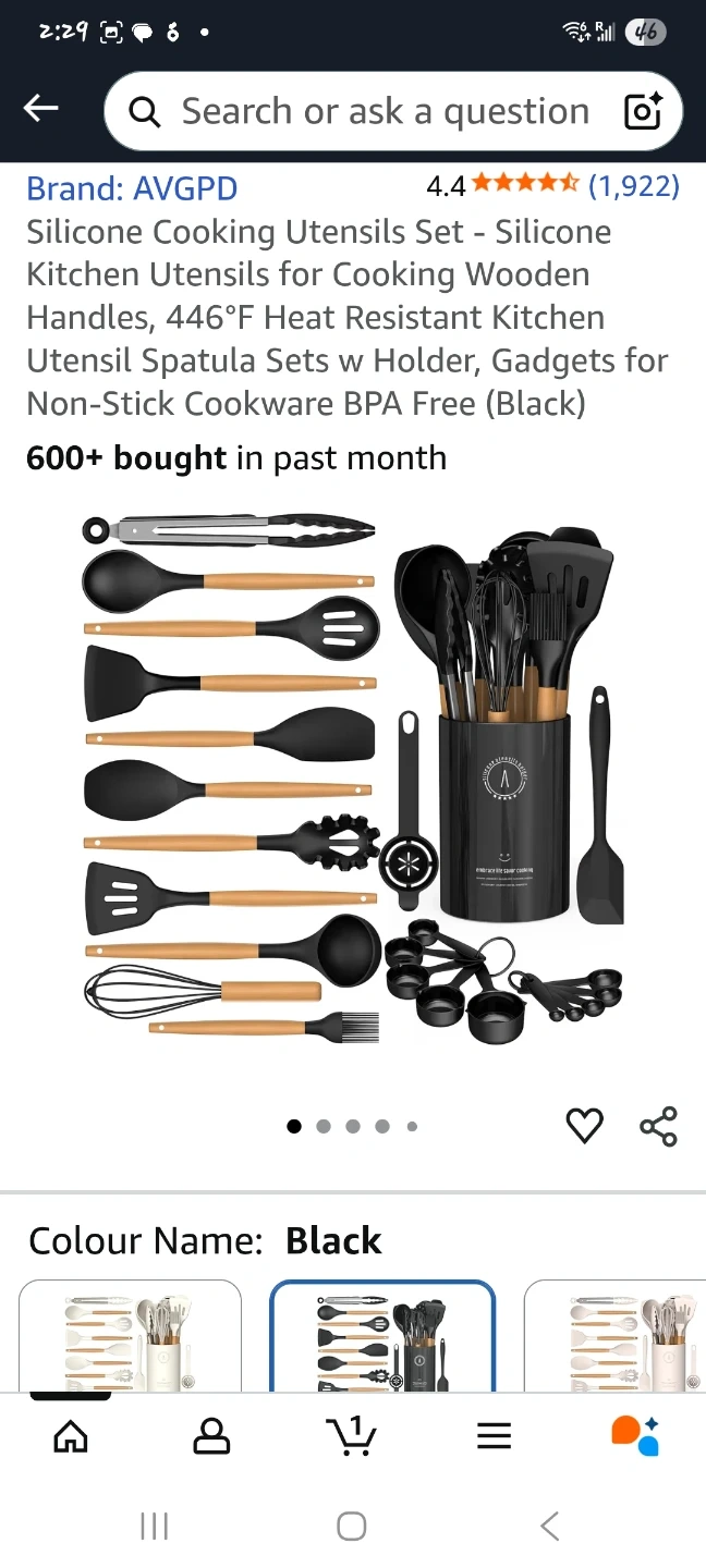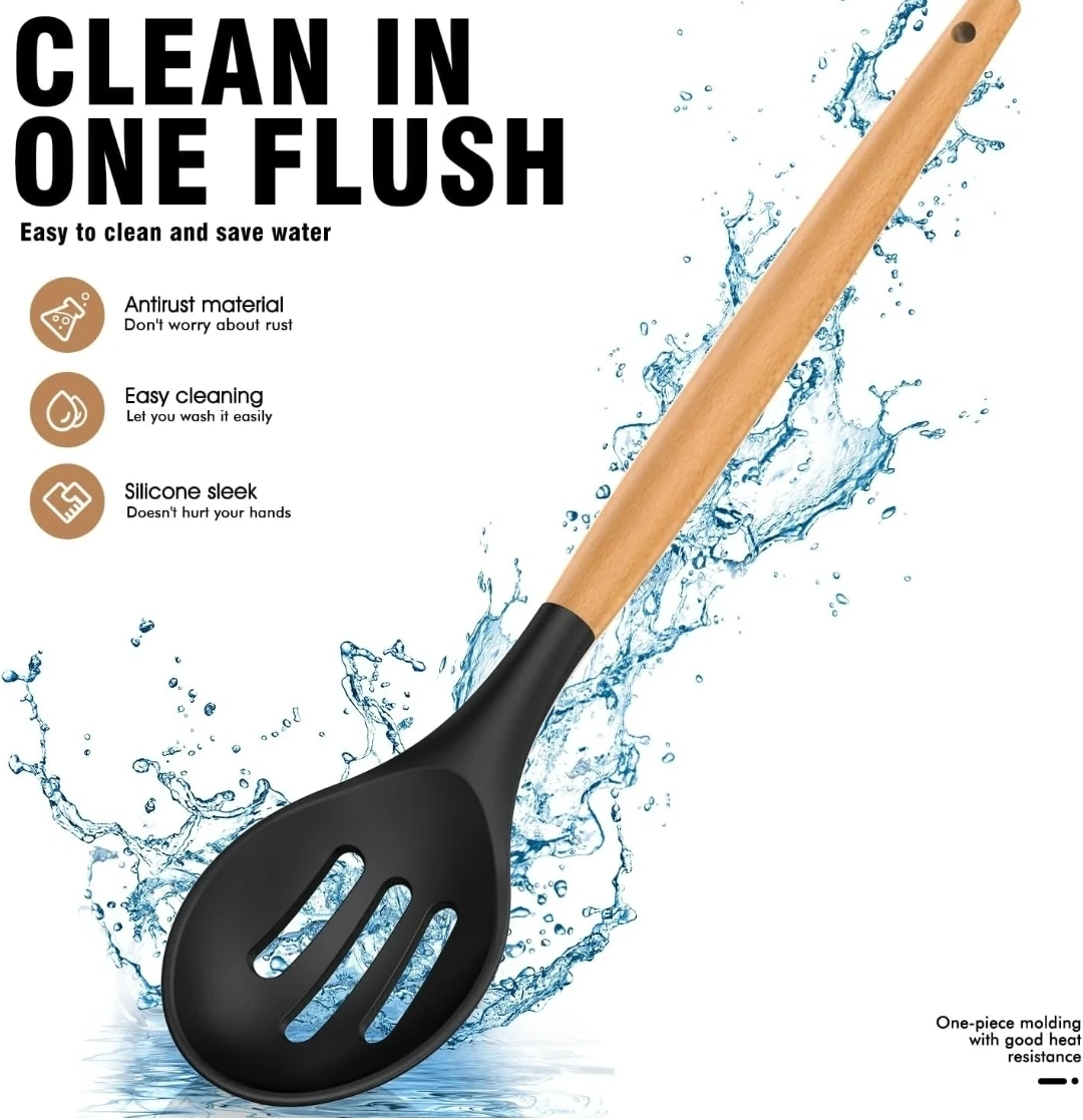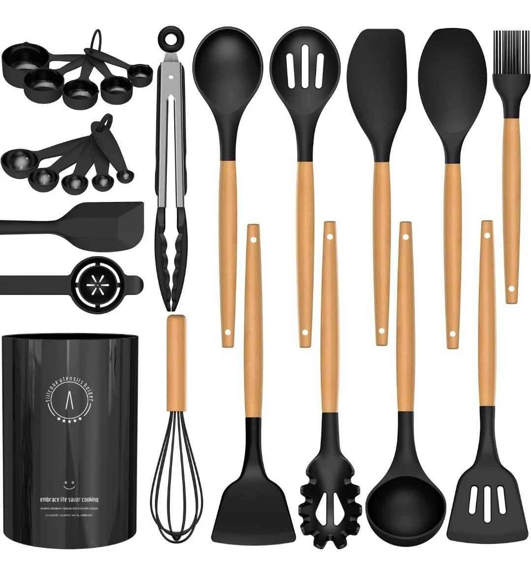 I'm selling a black silicone cooking utensils set by AVGPD. This set includes everything you need for cooking and baking! The utensils are heat resistant up to 446°F and are made with wooden handles. They are also non-stick, BPA free, and easy to clean. The set is designed for comfortable grip and safe use on all cookware surfaces
