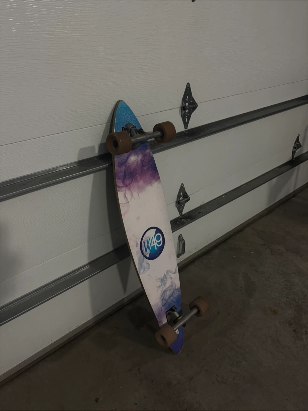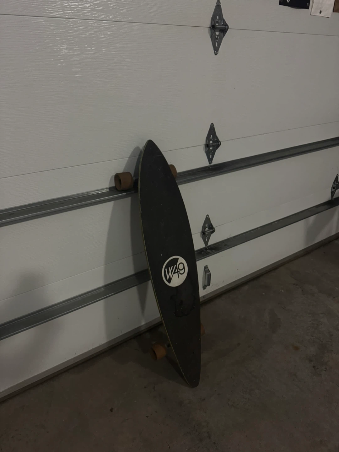 Selling a used W49 longboard skateboard. It's got a cool design on the bottom and is ready for some cruising around town. Super smooth ride- no problems- just a bit worn. Perfect for beginners or experienced riders looking for a fun board!