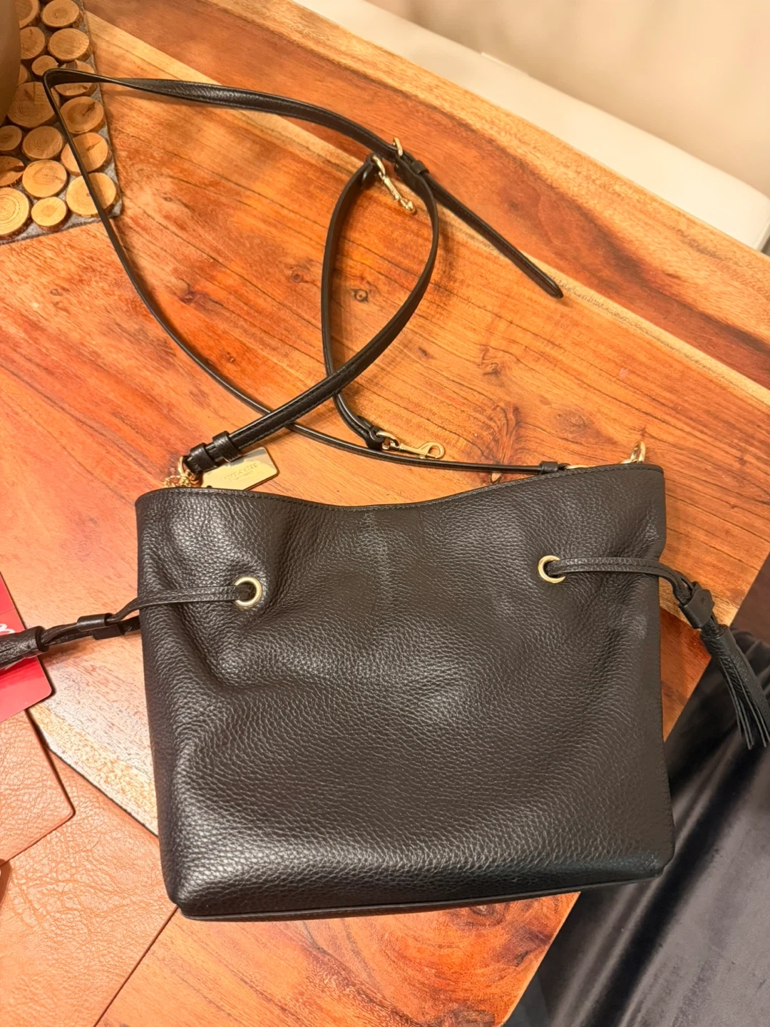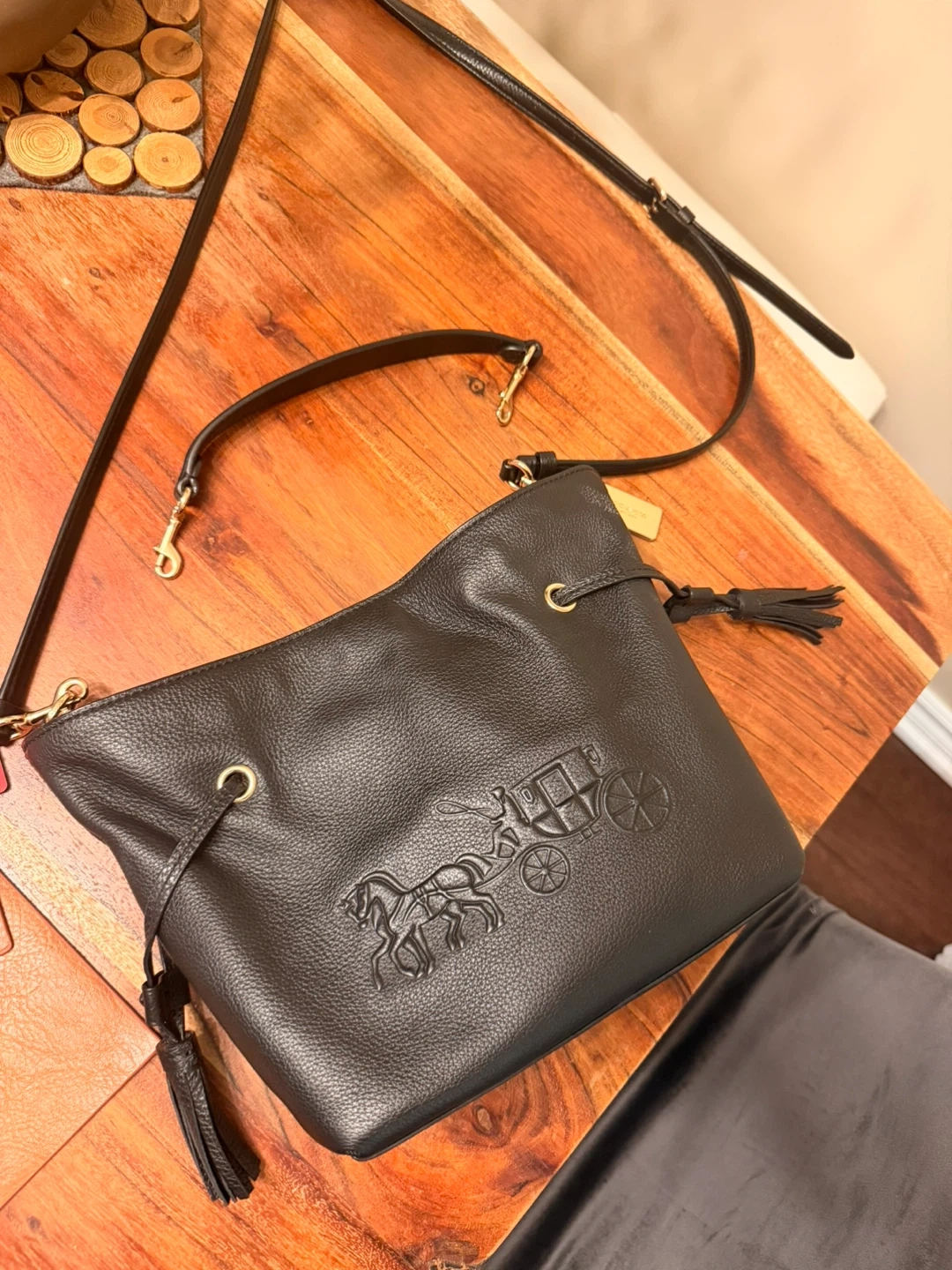 Selling a Coach black leather bucket bag. It's in great condition and features the iconic Coach horse and carriage logo embossed on the front. Perfect for everyday use!