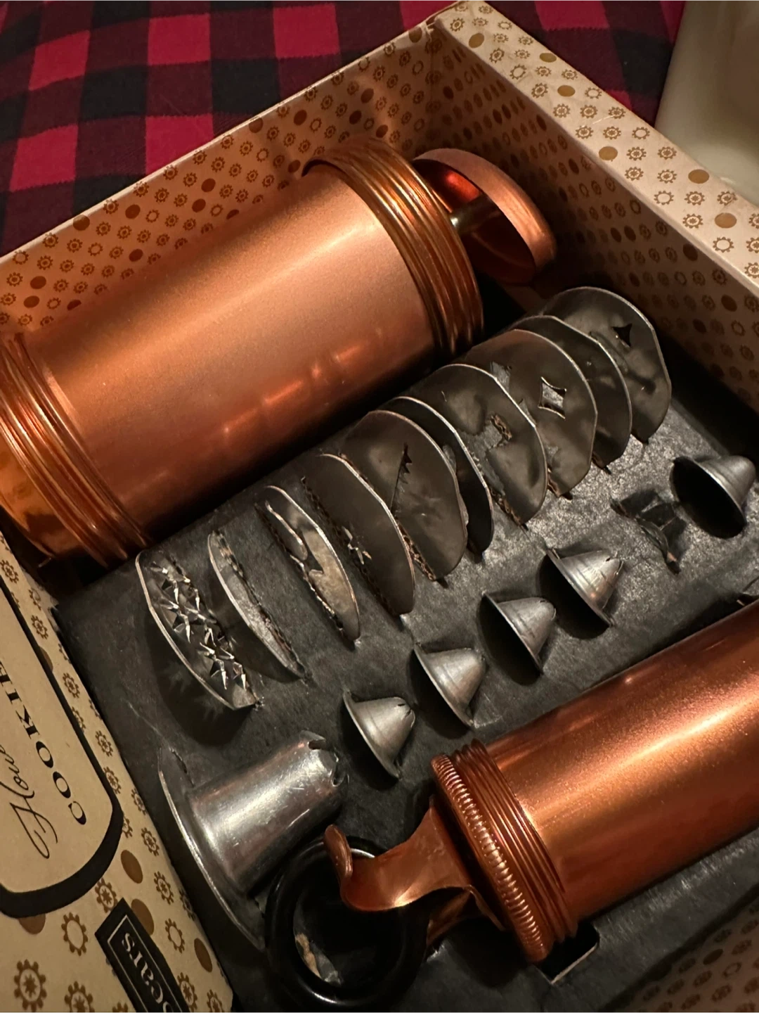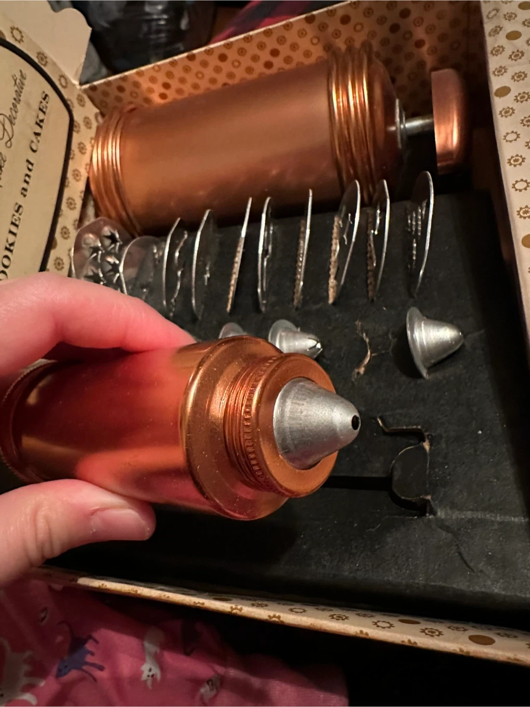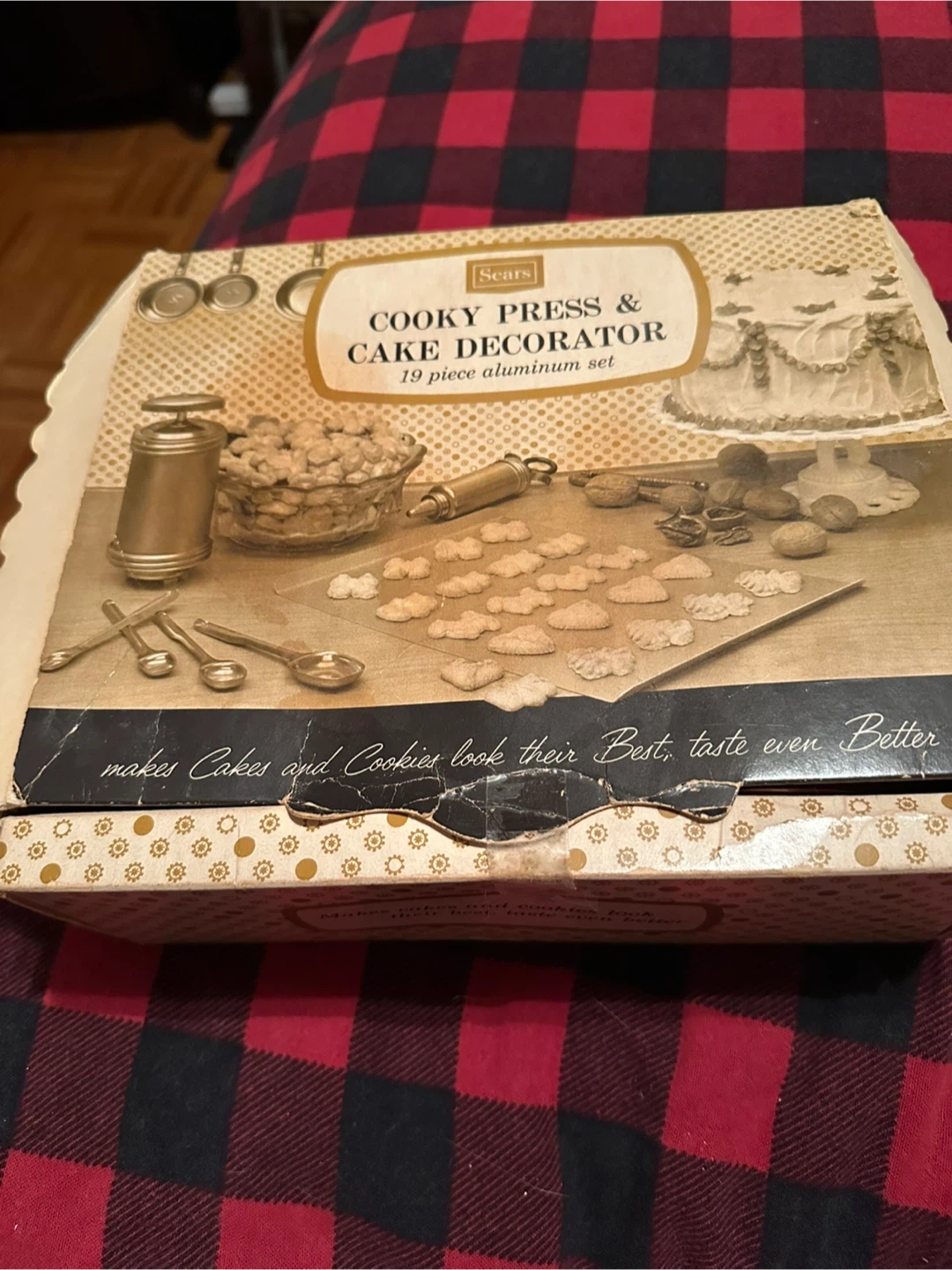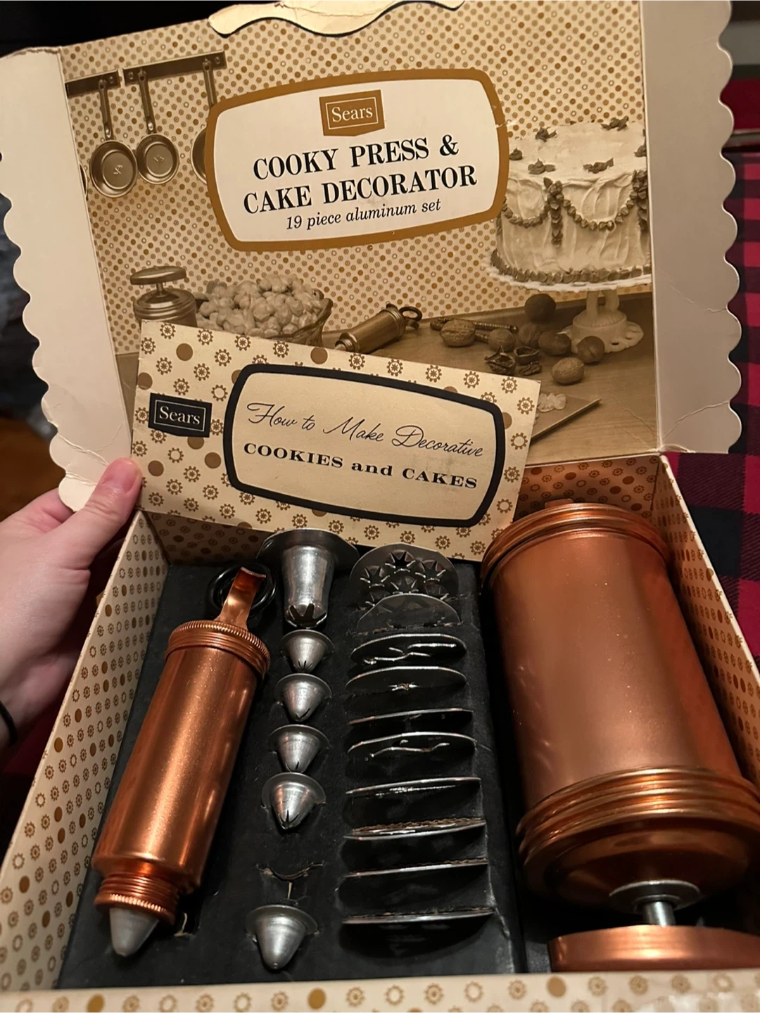 Selling a Sears Cooky Press & Cake Decorator 19-piece aluminum set! It makes cakes and cookies look their best and taste even better. The box is included, too!