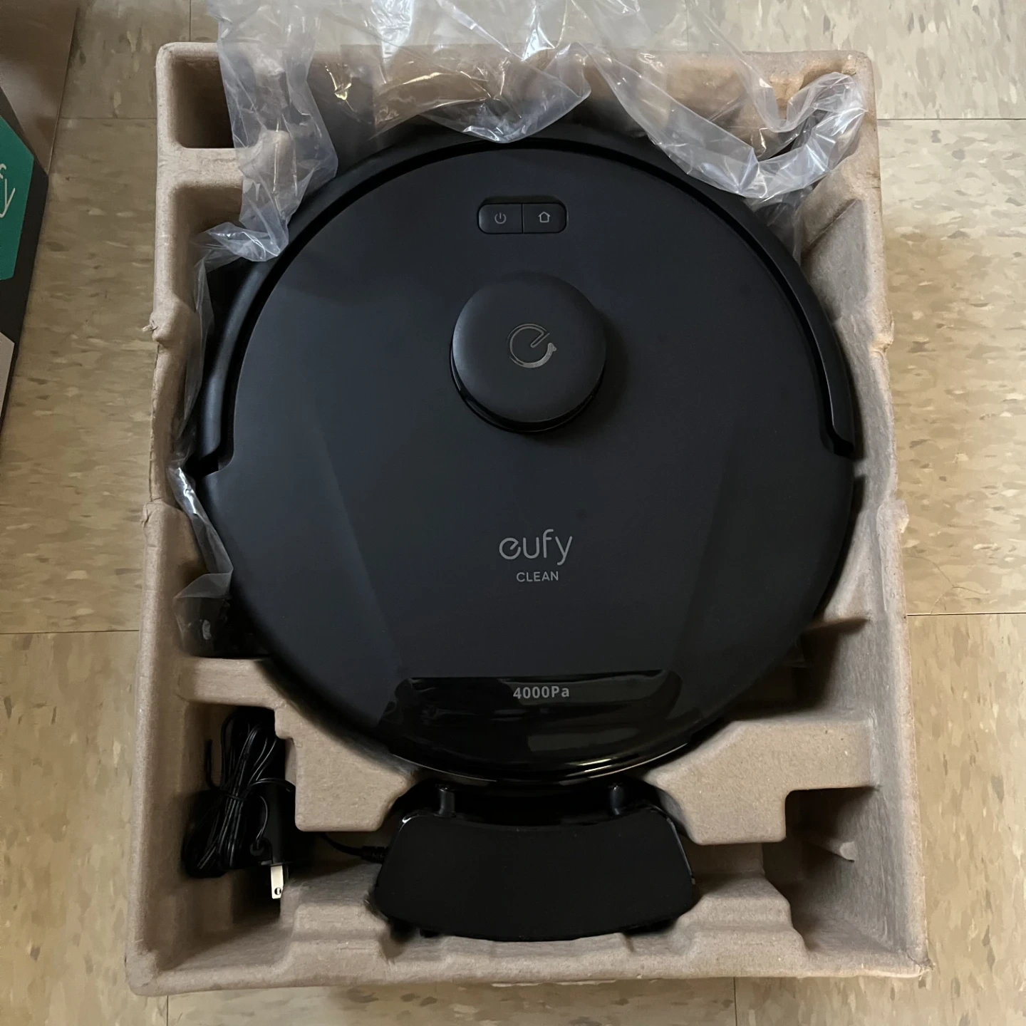 New Eufy Clean L50 robotic vacuum cleaner with intelligent laser navigation! It features powerful suction and customizable AI mapping. It can clim up to 20mm and is ideal doe hardwood floors, tile and carpet. The box includes the robotic vacuum, charging dock, and quick start guide.