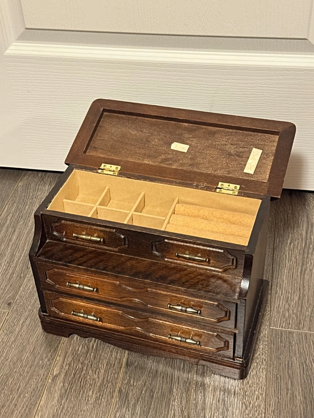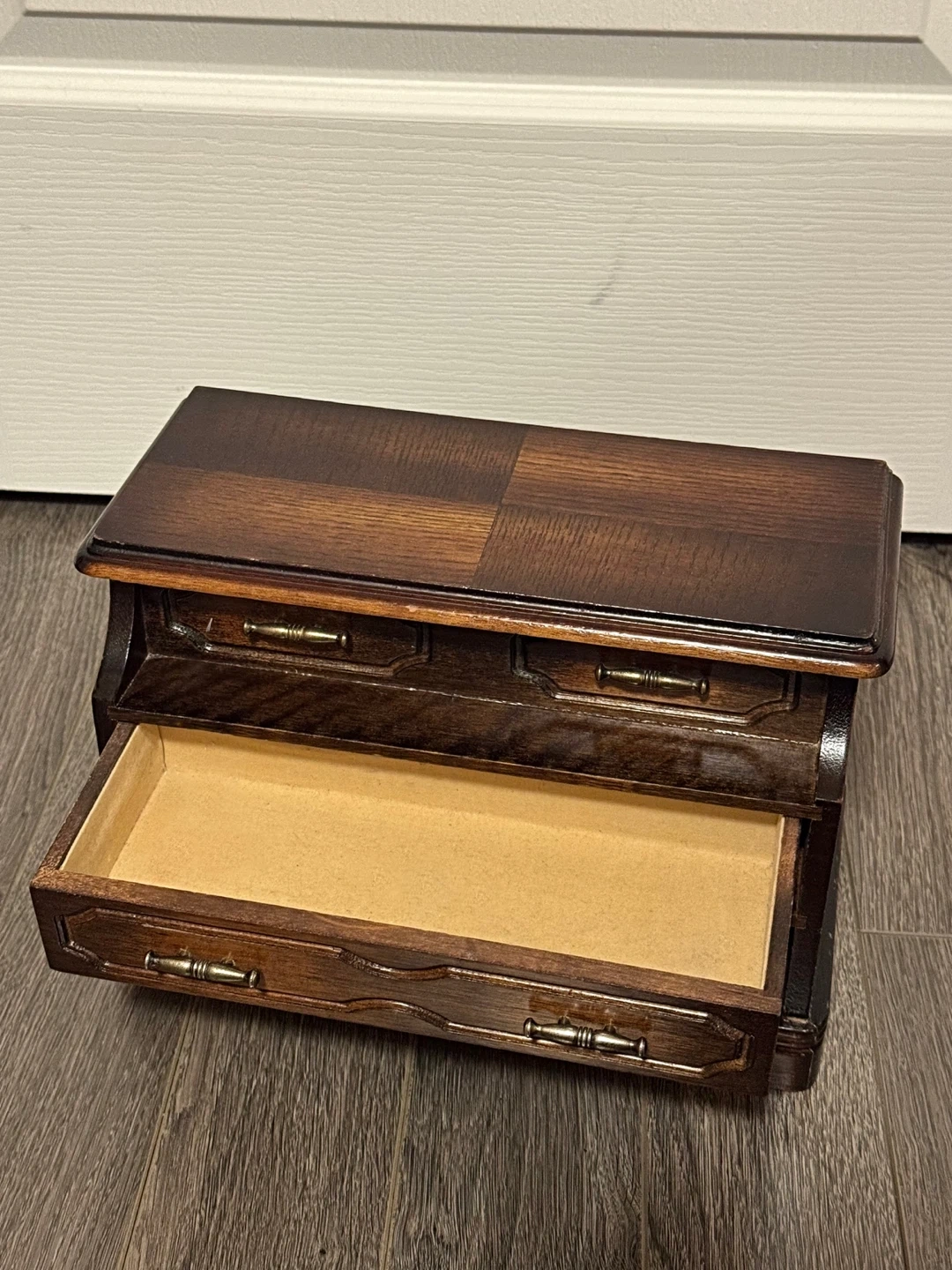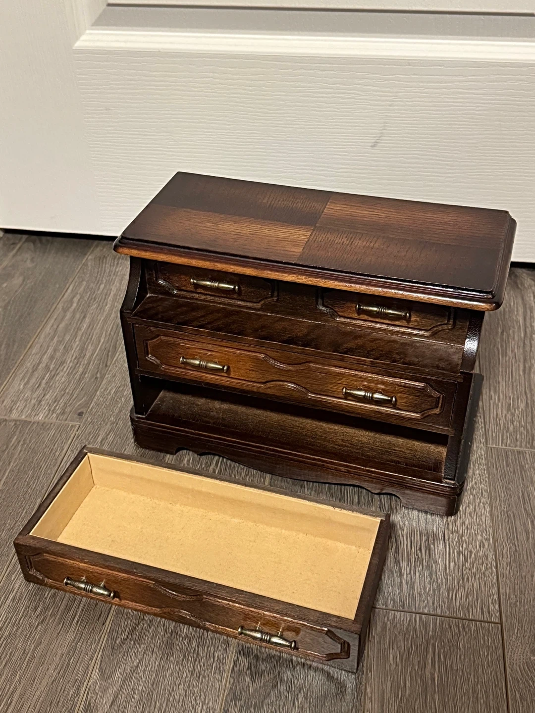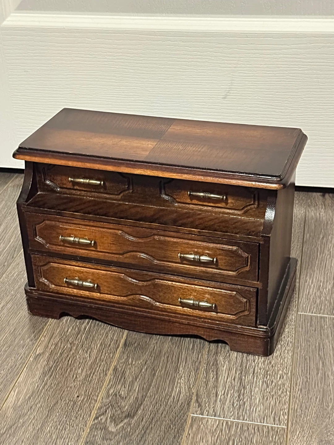Selling a lovely antique wooden jewellery box! It features a lift-top compartment and 2 drawers, perfect for organizing your rings, necklaces, and other treasures. The dark wood finish and brass-tone hardware give it a classic and elegant look. Music plays when you open the last drawer.
