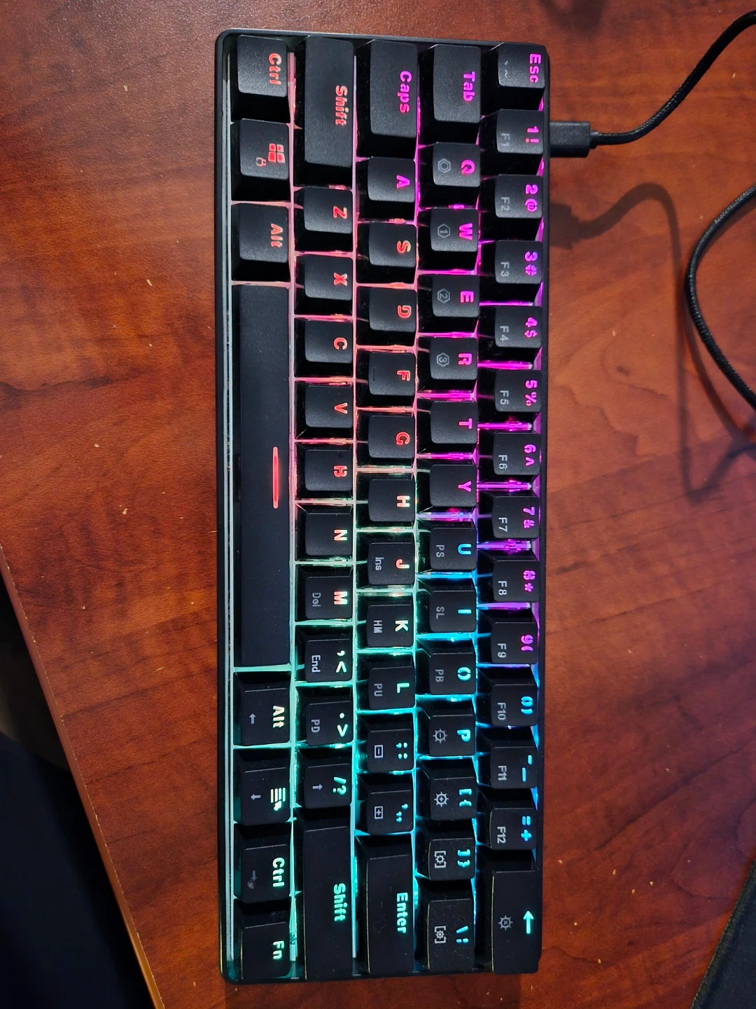 Compact 60% mechanical gaming keyboard with RGB backlighting and blue clicky switches. Tactile and responsive—great for typing and gaming. Wired USB connection. All keys work perfectly. Space-saving layout, ideal for desk setups.