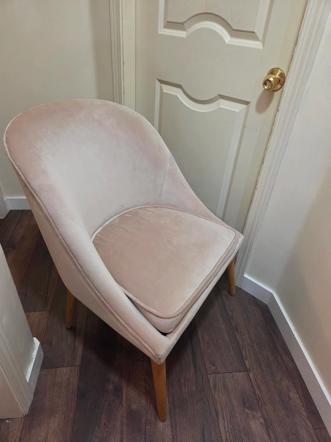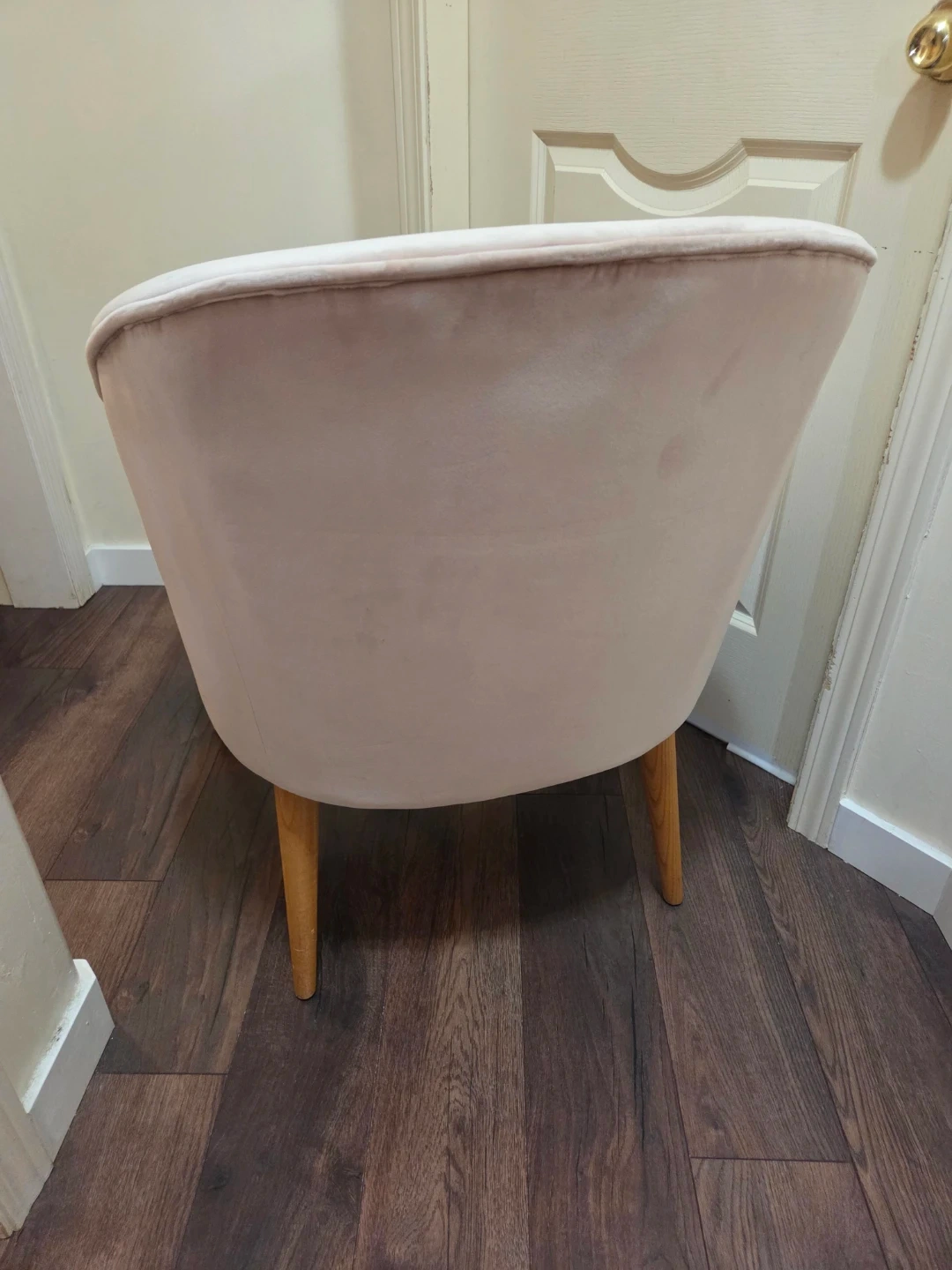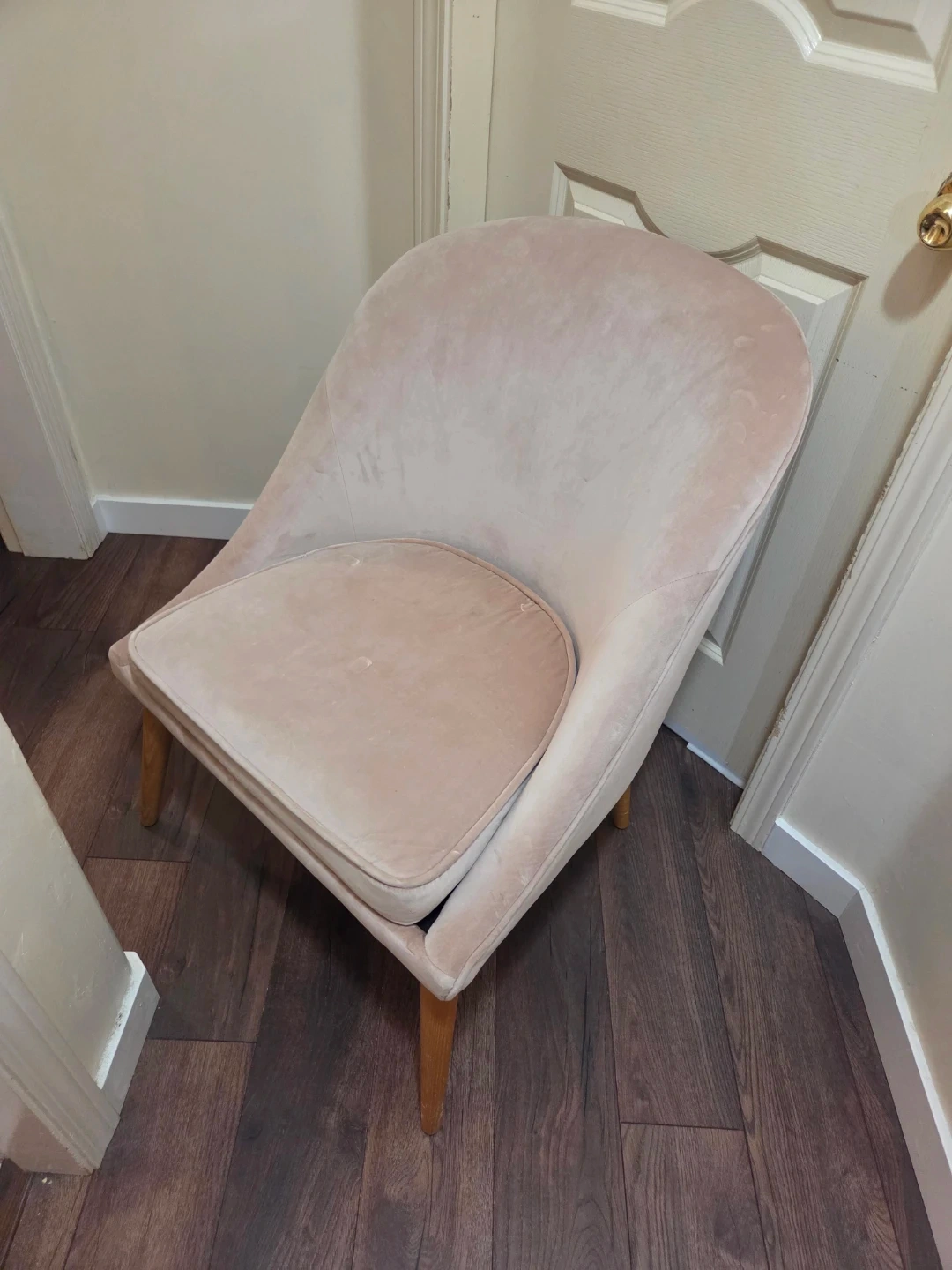 Selling a cute pink accent chair! It's in good condition (a few minor scuffs on the legs) and would look lovely in any room. The chair is a soft, light pink colour with wooden legs. It's perfect for adding a touch of elegance to your space