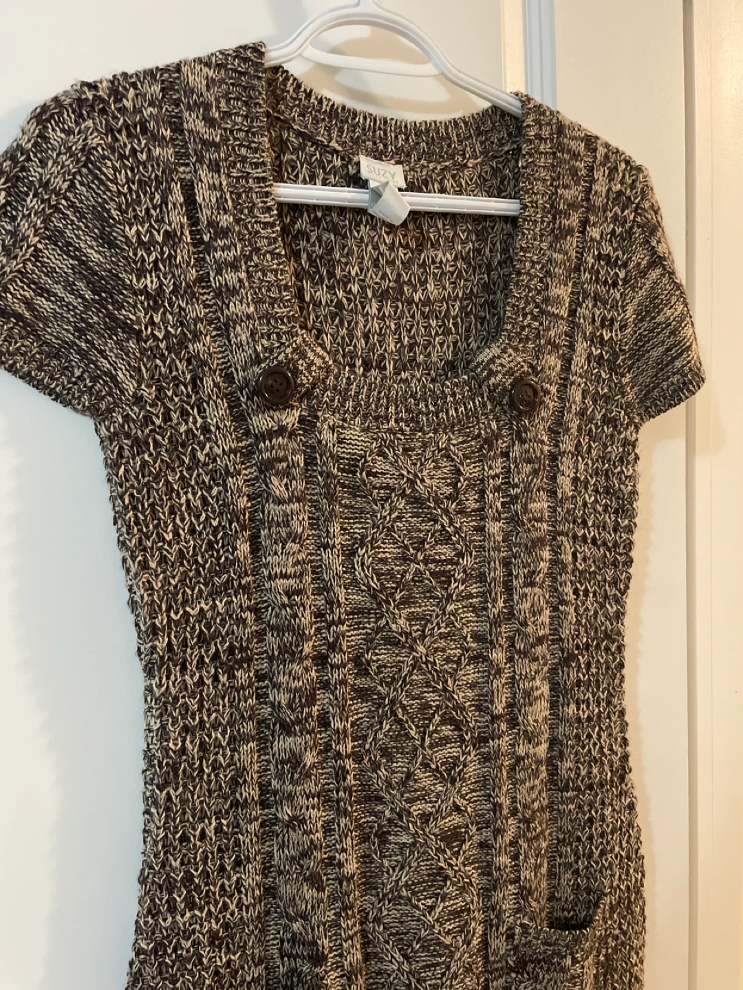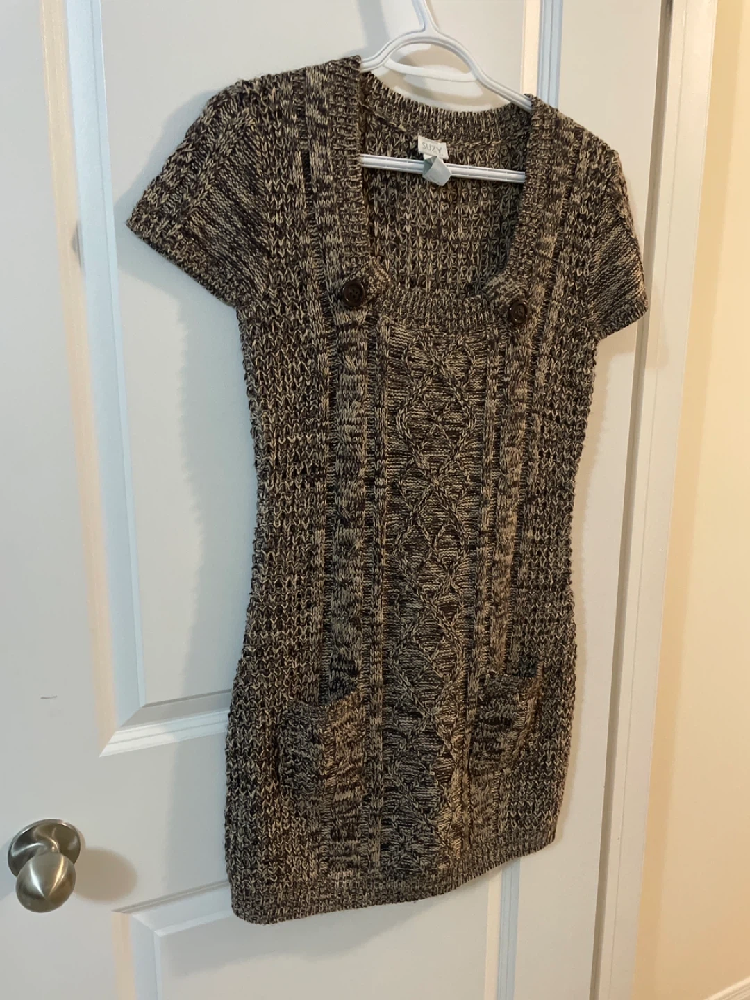 Cozy up in this Suzy Shier knit dress! It's a size large and features a lovely brown and cream pattern. Perfect for layering or wearing on its own with some cute boots. Never worn, brand new