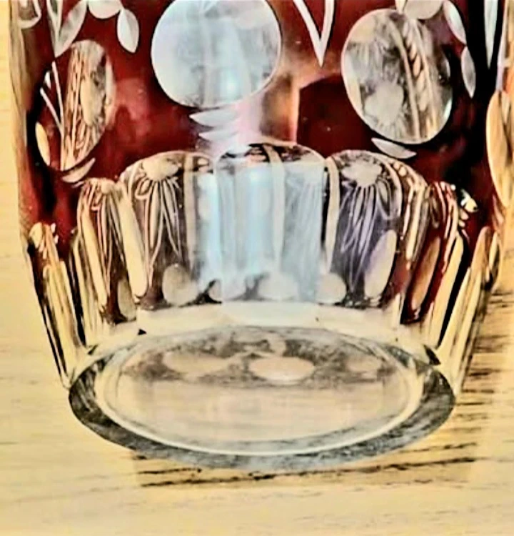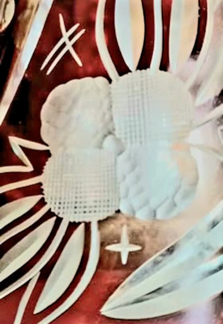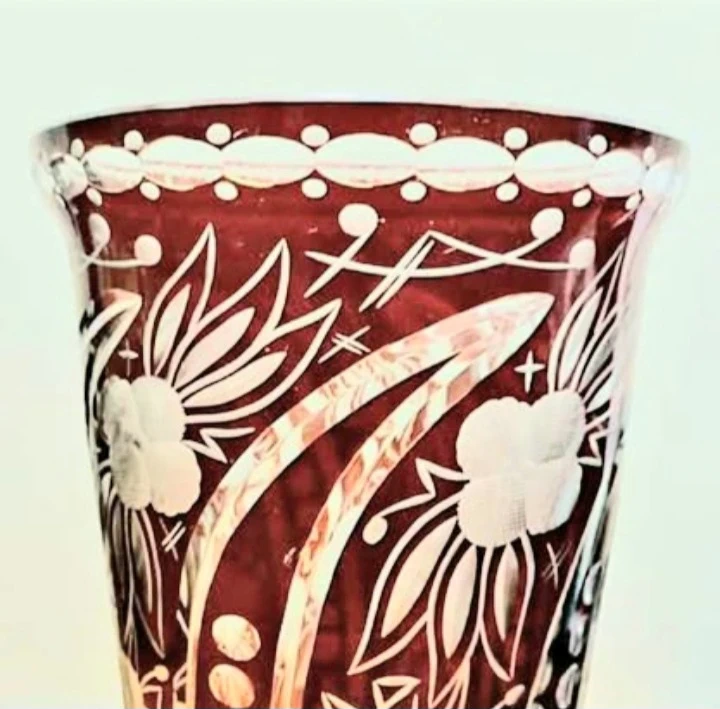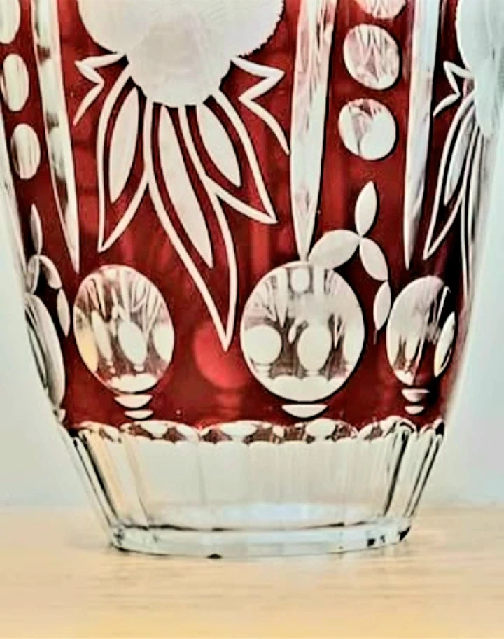 - The vase features a rich ruby-red hue, achieved through a 19th-century staining technique using silver nitrate.