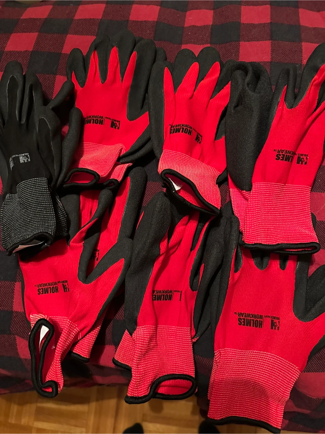 Selling a set of Holmes Workwear gloves in red and black. These are great for various tasks around the house or on the job site. They offer a good grip and protection for your hands. Please take a look at the pictures for details!
