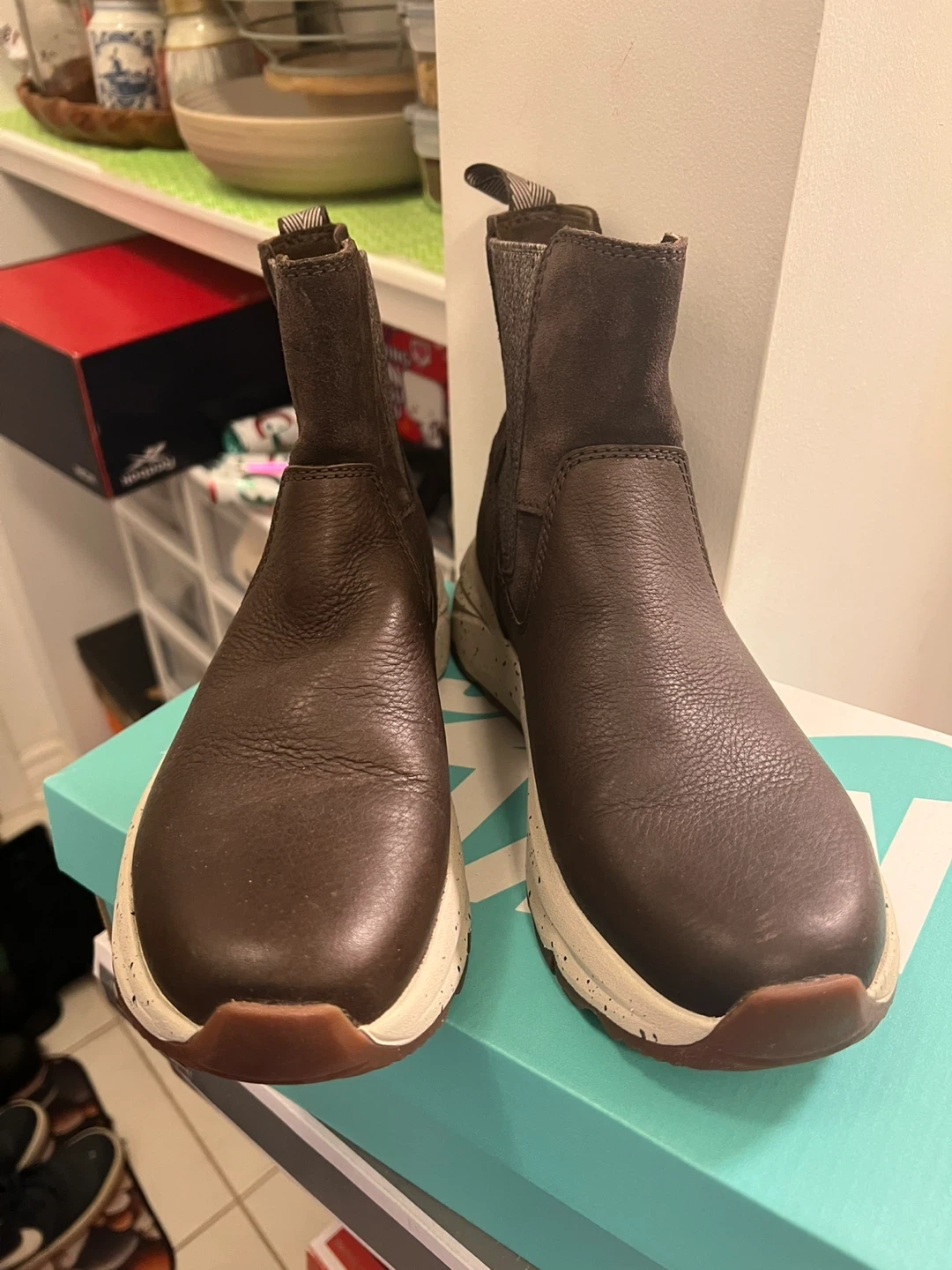 These are a pair of brown leather Chelsea boots from Kodiak . They have a white speckled sole and a red-brown patterned outsole. They're in great condition and ready for the cooler weather. Used once size 37 US, 37.5EU