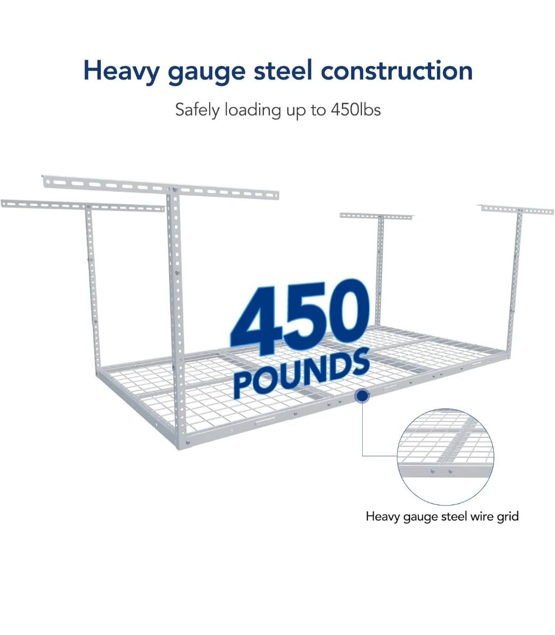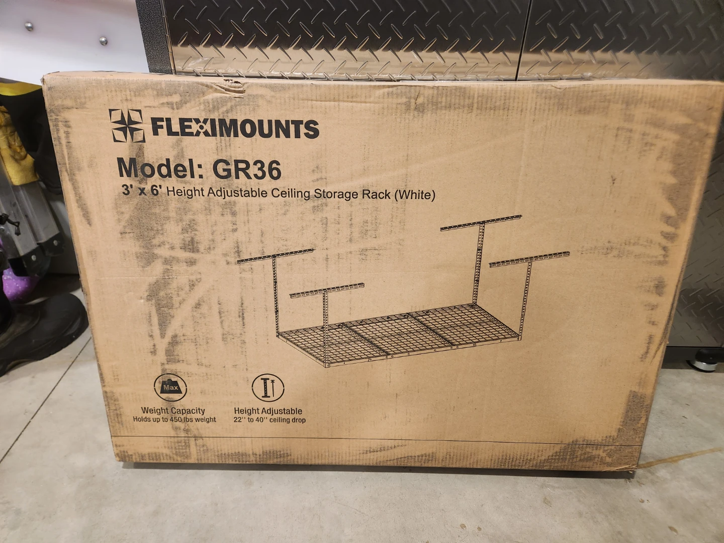 I'm selling a FLEXIMOUNTS GR36 ceiling storage rack in white. It's height adjustable 22 inches to 40 inches and can hold up to 450lbs. It measures 3' x 6'. New, still in box never opened.