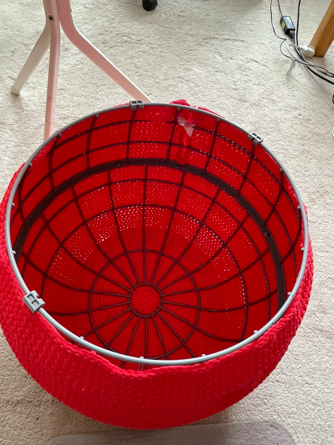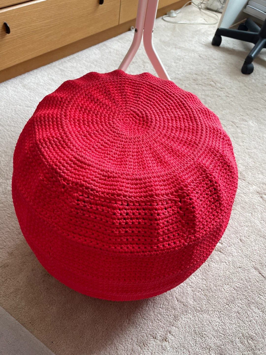 gorgeous IKEA pouf ottoman with metal frame.The removable cover is crocheted with a bright red yarn. This unique piece is not just a footrest but also a cozy extra seat. It's in good condition and ready to bring a touch of whimsy to your home decor. Can use indoor or outdoor (I use indoors only). Cash, self pickup.