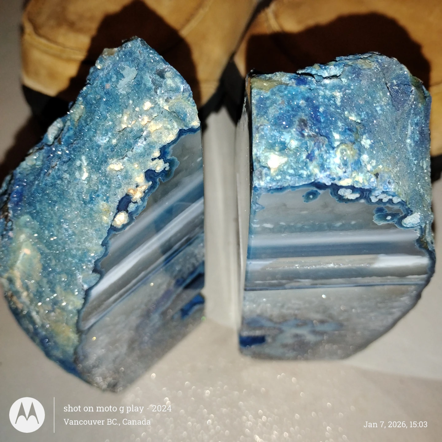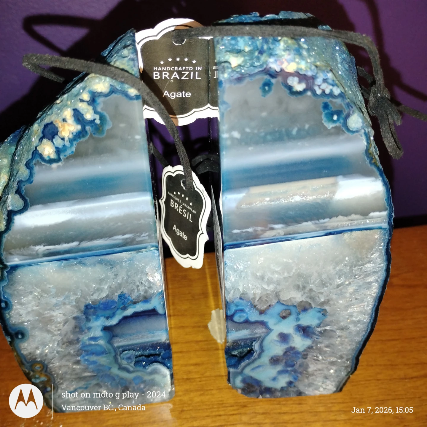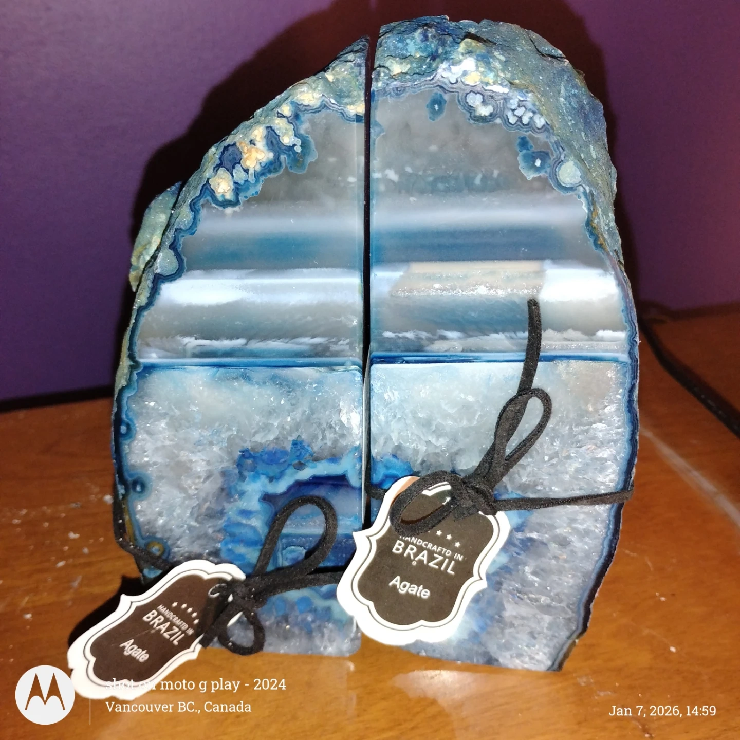 "Rare" with "Gold" Strike "Ultimate" "Spiritual" and "Save" in Torquay and Shade of Gold which These beautiful agate bookends are handmade in Brazil and would be a lovely addition to Spiritual Life and can be displayed in Single or in Two as a sampling guidance or just any bookshelf or desk! The blue and white tones are very calming. They are in great condition and ready for a new home