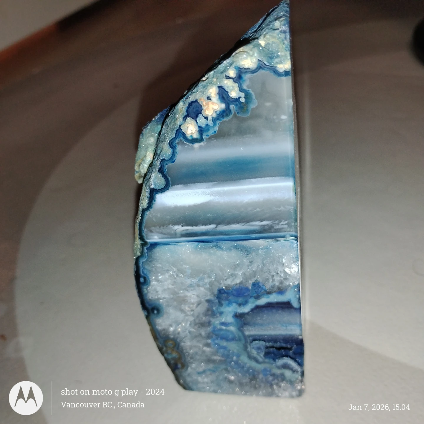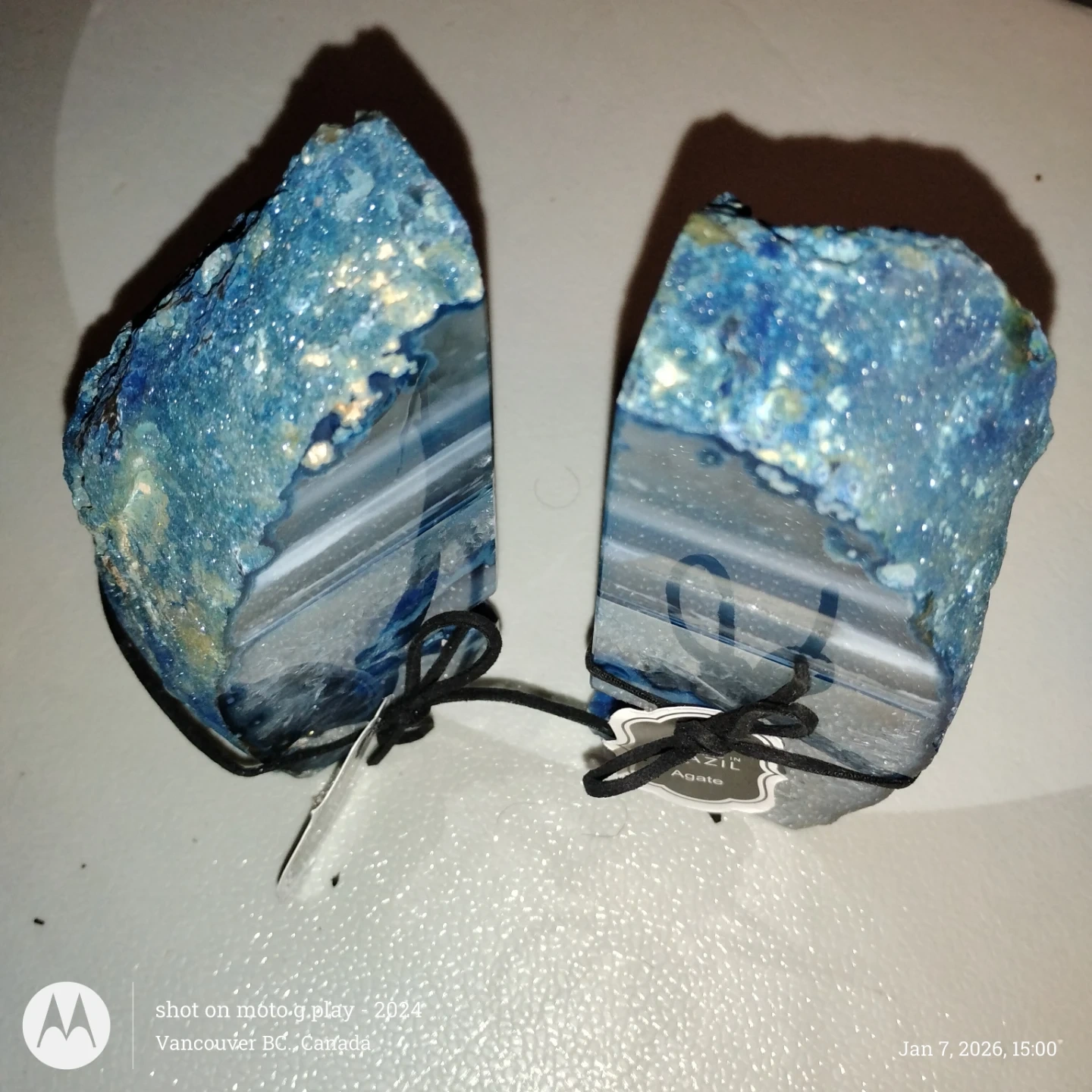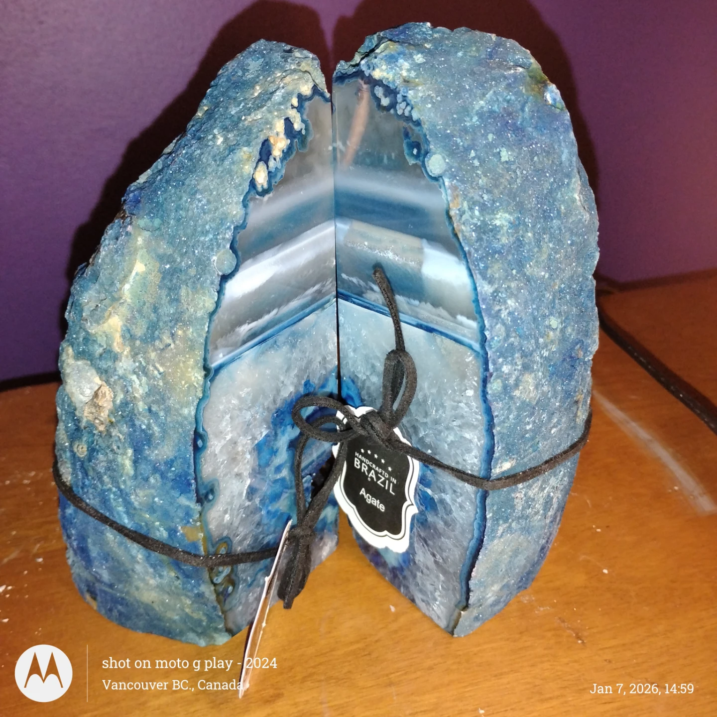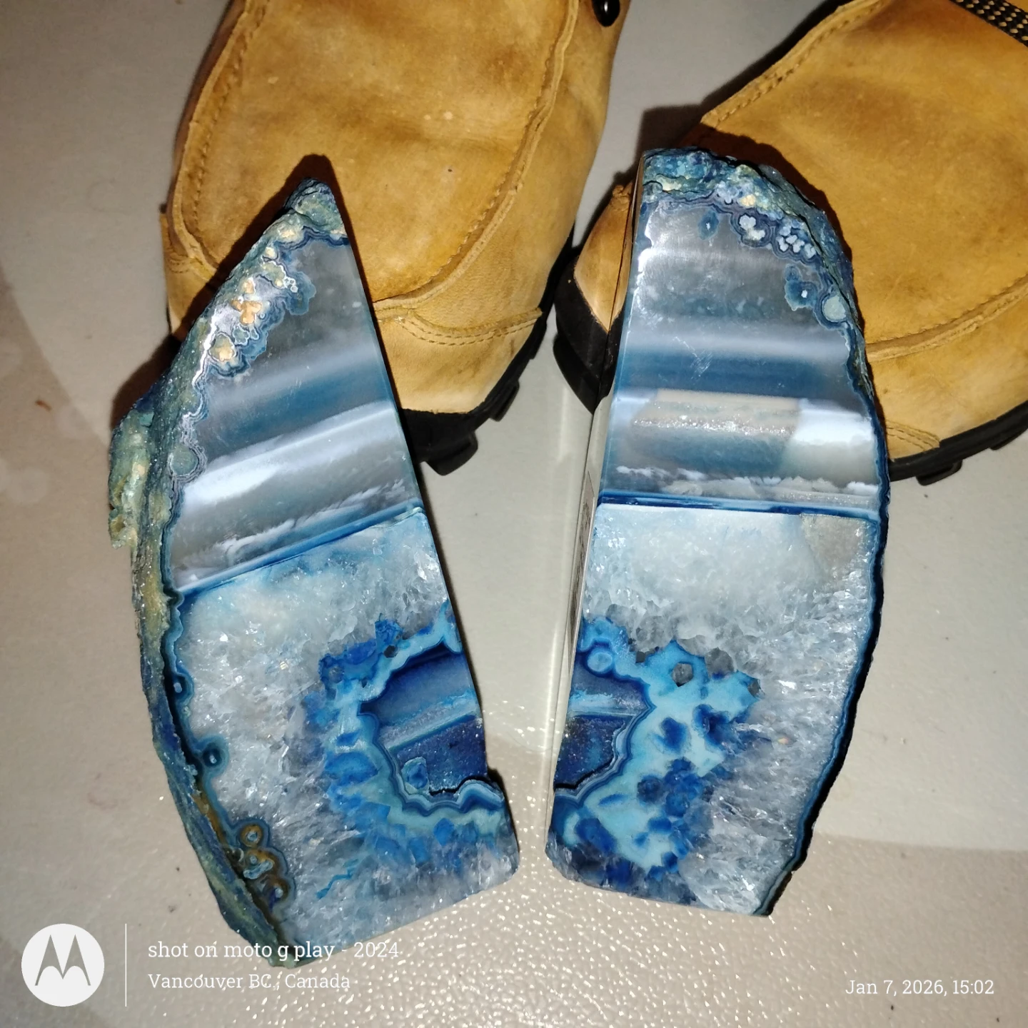 "Rare" with "Gold" Strike "Ultimate" "Spiritual" and "Save" in Torquay and Shade of Gold which These beautiful agate bookends are handmade in Brazil and would be a lovely addition to Spiritual Life and can be displayed in Single or in Two as a sampling guidance or just any bookshelf or desk! The blue and white tones are very calming. They are in great condition and ready for a new home