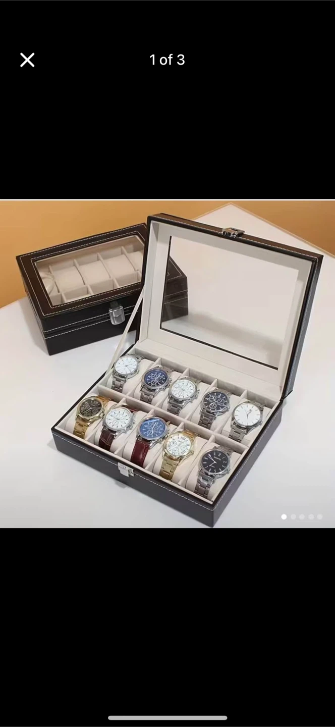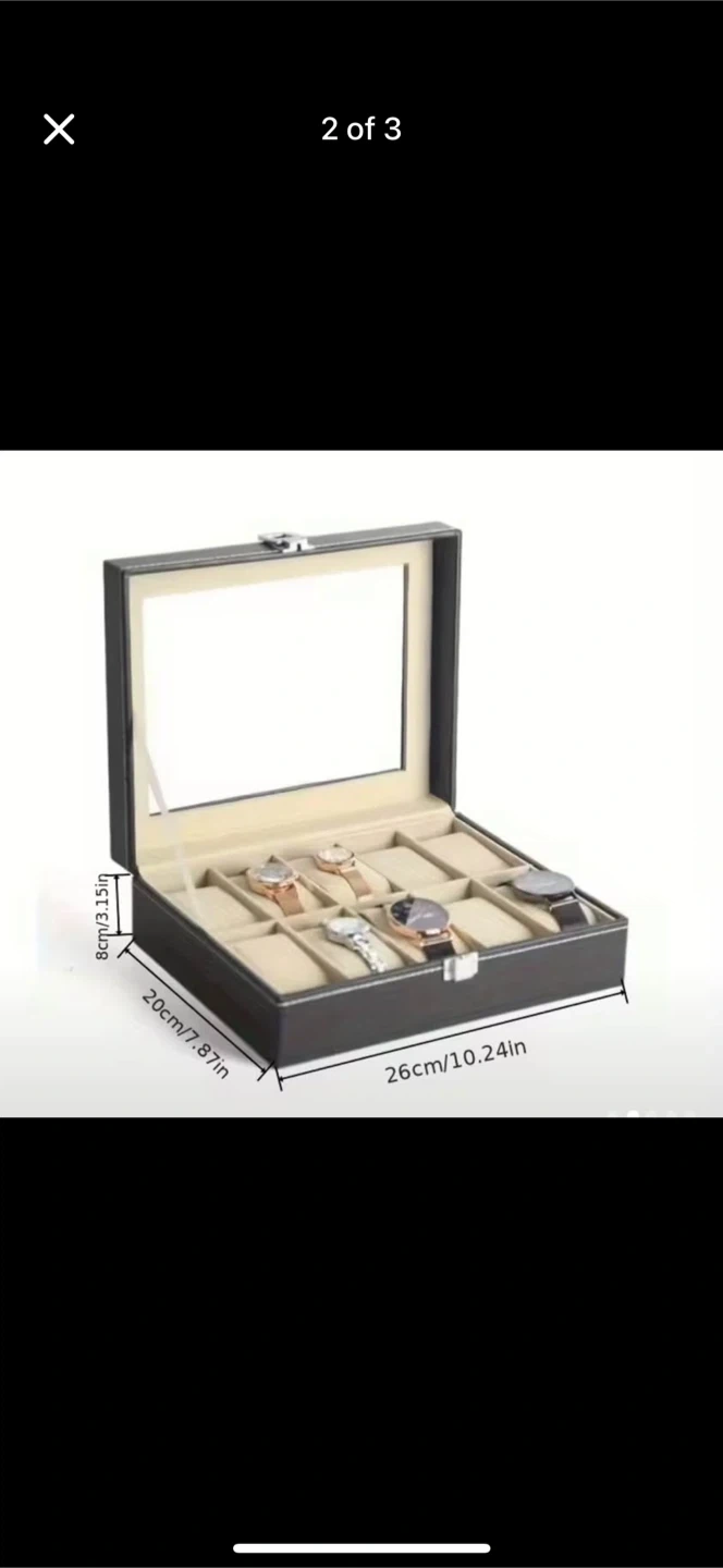Here's a brand new black watch display case organizer! It's perfect for keeping your watches safe and neatly displayed. The dimensions are 26cm/10.24in x 20cm/7.87in x 8cm/3.15in. It comes with the box