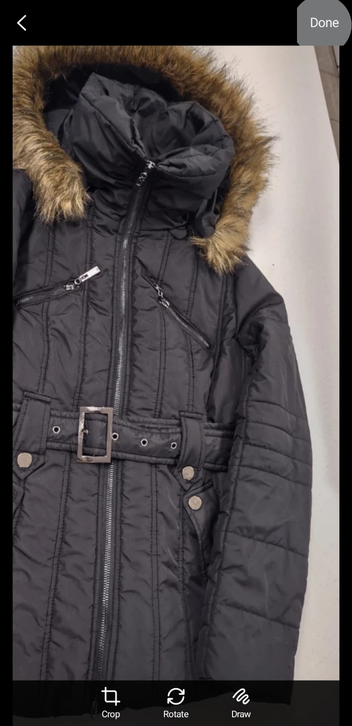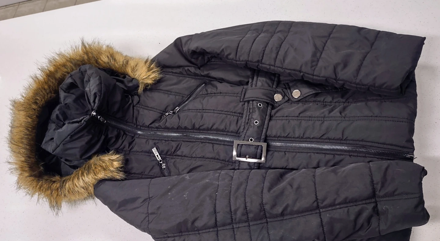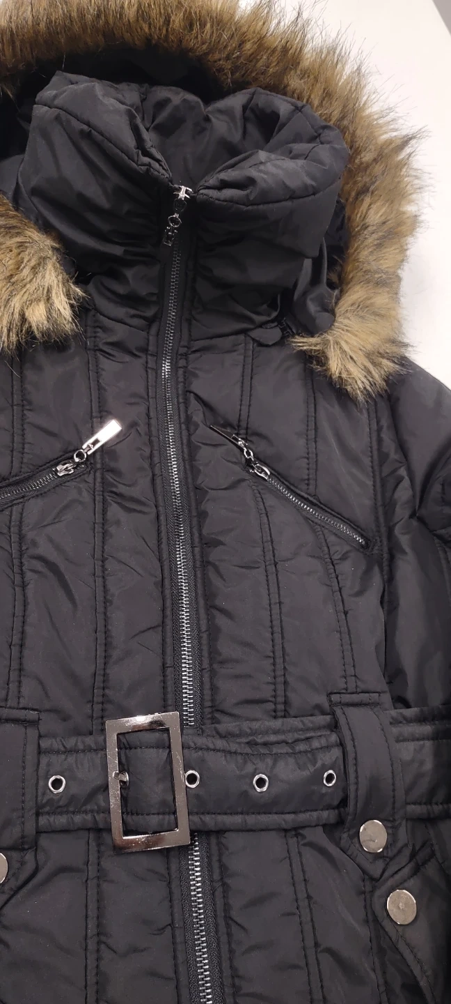 Selling a black winter jacket featuring a stylish fur hood! It has a belted design and is perfect for keeping warm during the colder months. The jacket appears to be in good condition and ready for a new owner.