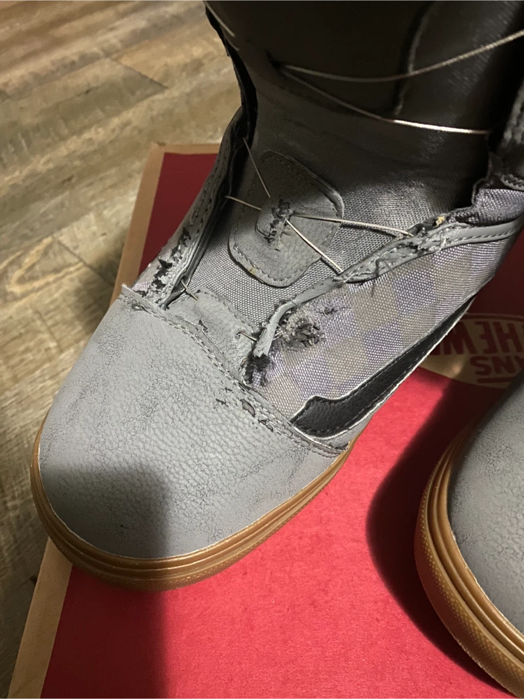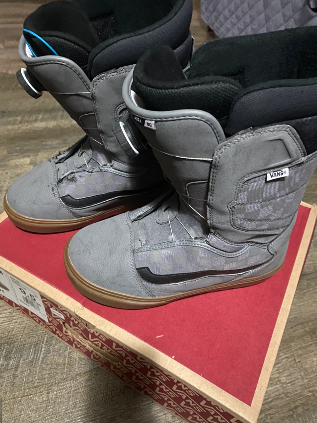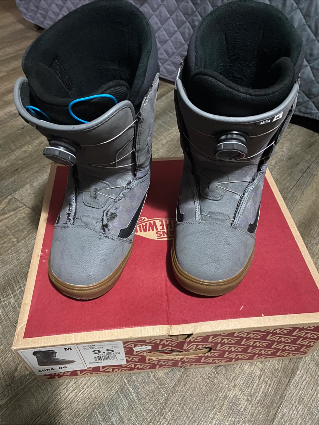 Selling a pair of Vans Aura OG snowboard boots in size 9.5. They show some signs of wear, as you can see in the photos. The original box is included!