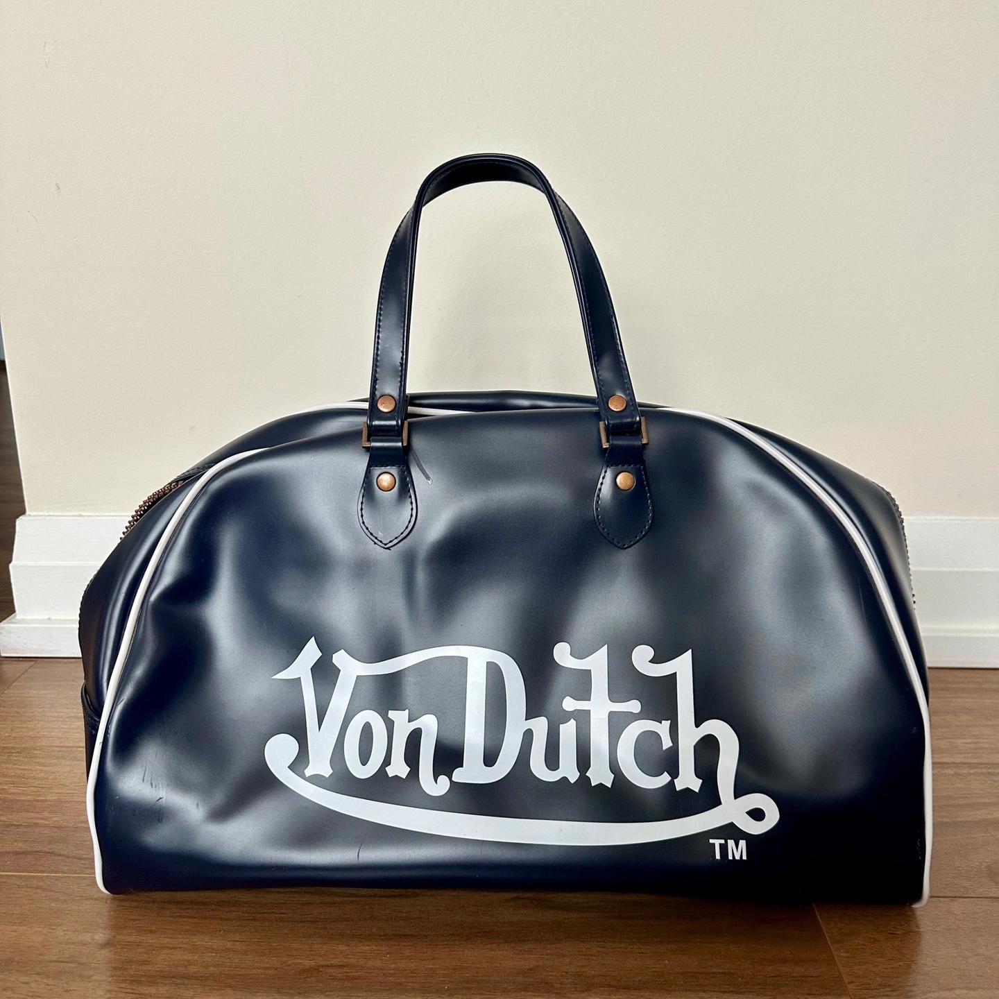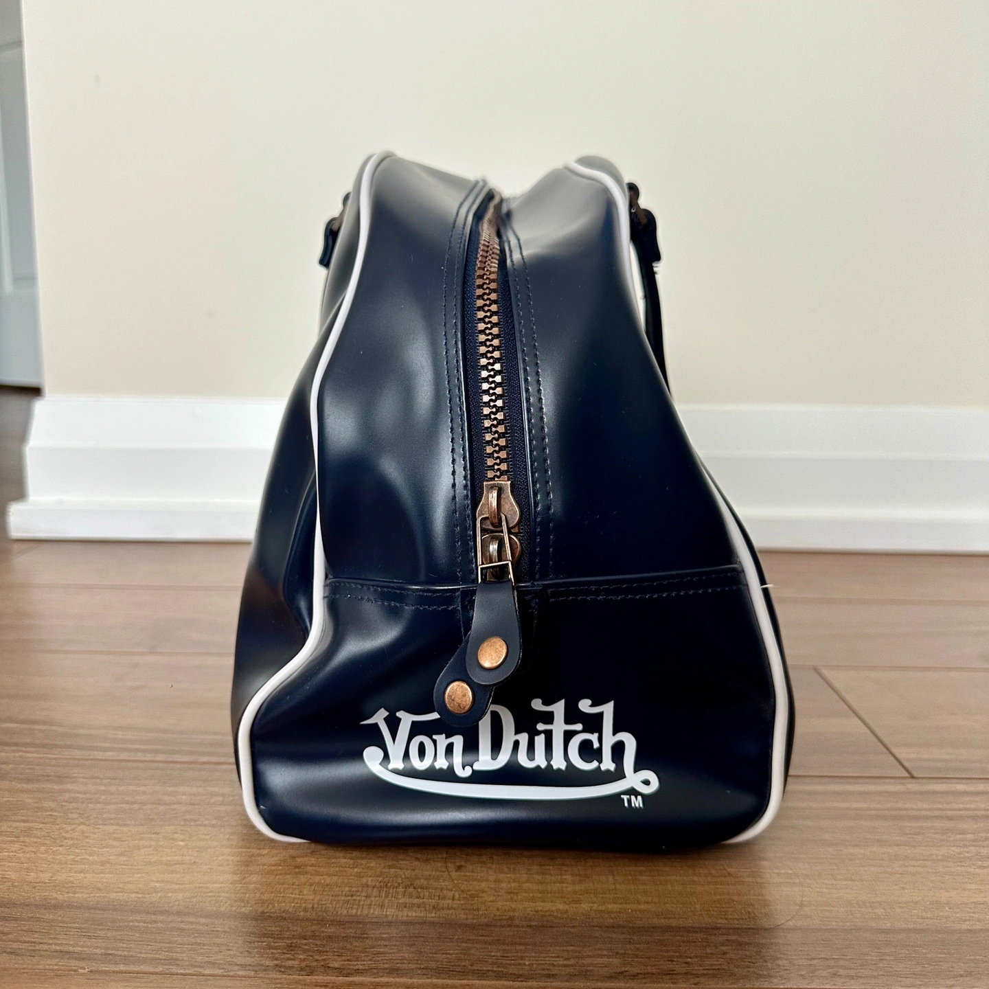 Used, but in amazing condition, vintage Von Dutch vinyl duffle bowling bag. Colour is navy blue with white lettering / detailing. There is one zipper compartment on the inside. Brass metal zipper and detailing. Brass metal feet to protect bag. Makes for a great and stylish travel / weekender bag!