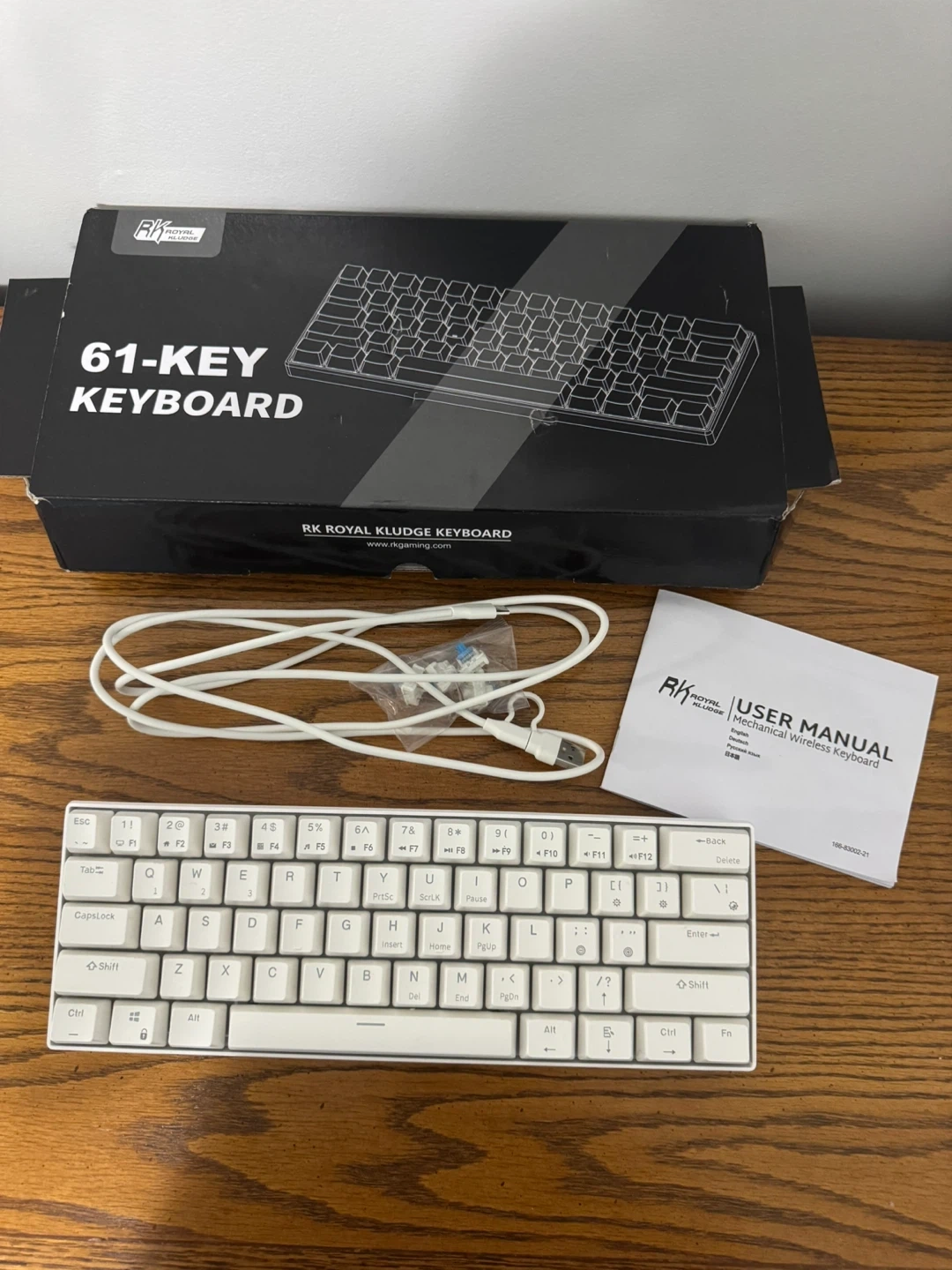 Selling a Royal Kludge RK61 mechanical wireless keyboard in white. It's a 61-key keyboard and comes with the original box, user manual, and USB cable. Great for a compact setup!