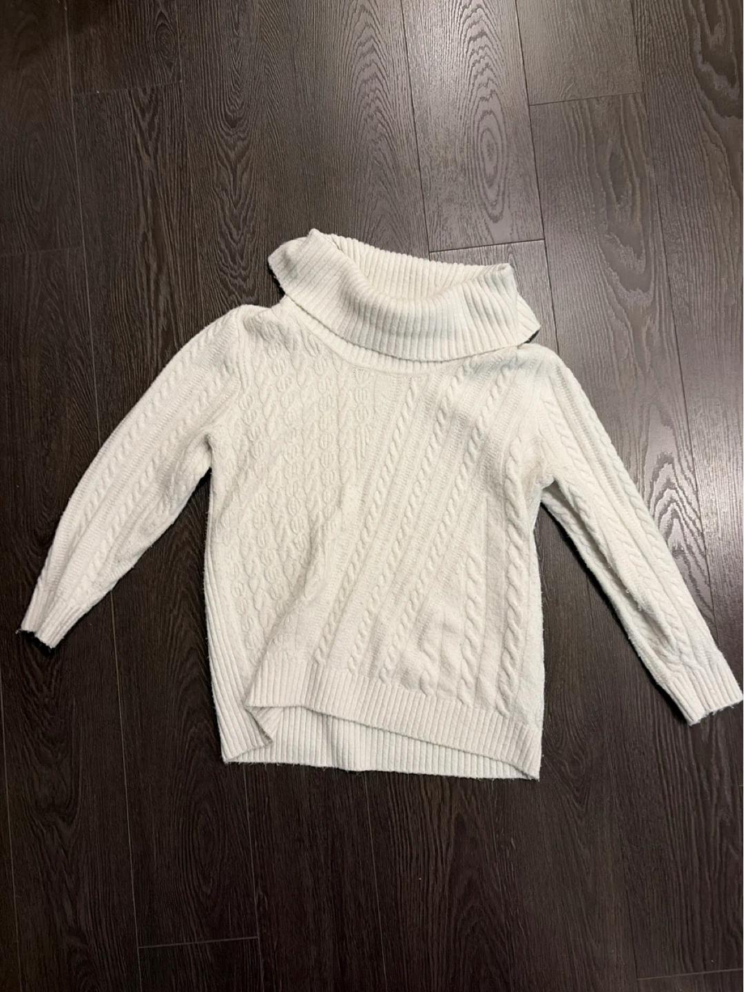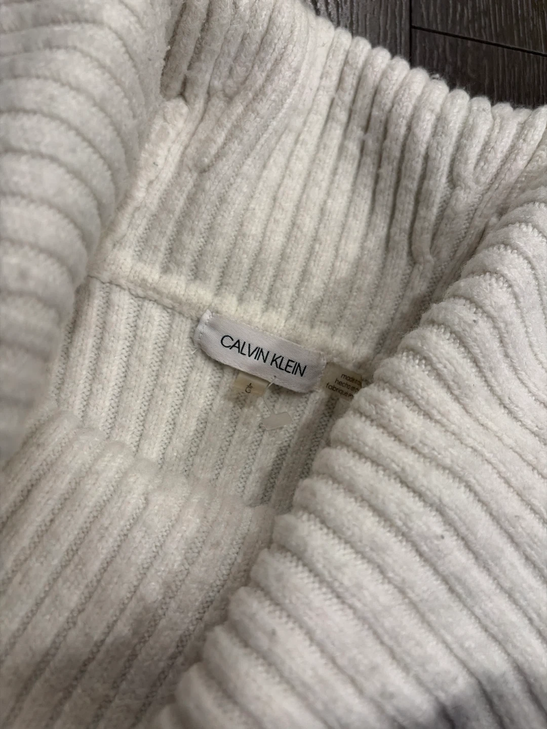 Cozy up in this Calvin Klein white knit sweater! It's a size large and features a stylish turtleneck design. Perfect for staying warm and fashionable during the cooler months. It's in great condition and ready for a new home!