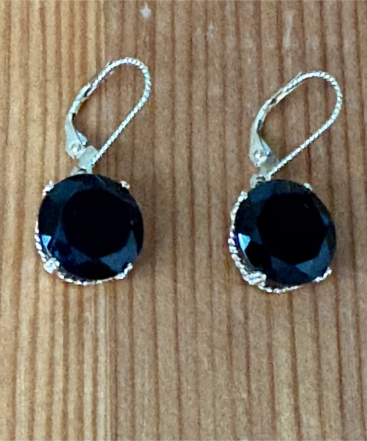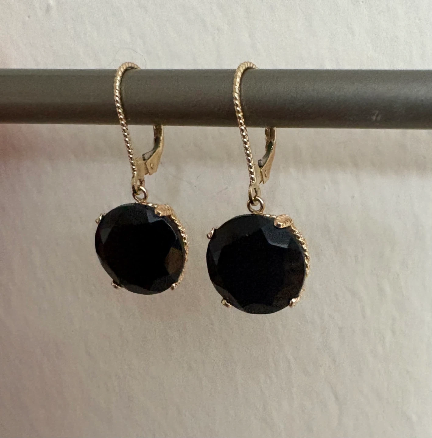 Only worm a handful of times!! 14k yellow gold twisted around black “diamonds” (they’re cut/shaped like black diamonds). Unsure of what the stones are now, as I bought these long ago and forgot about them pretty much! They do shine BEAUTIFULLY!!