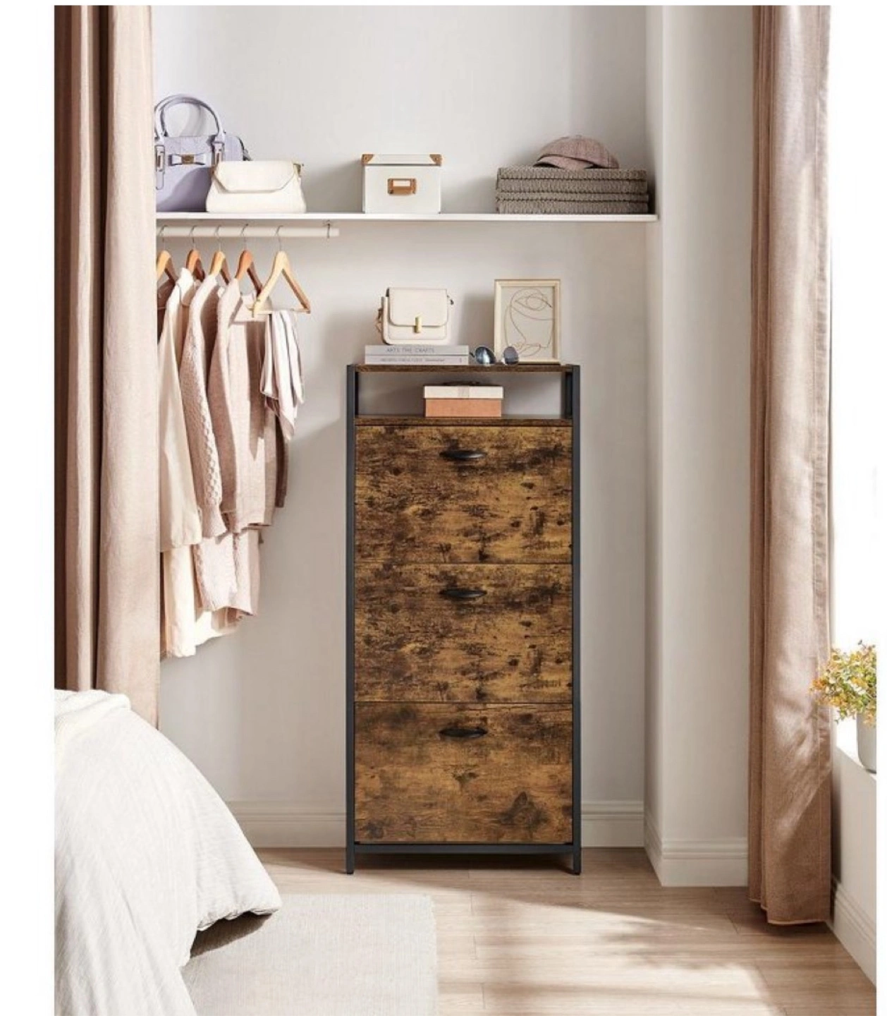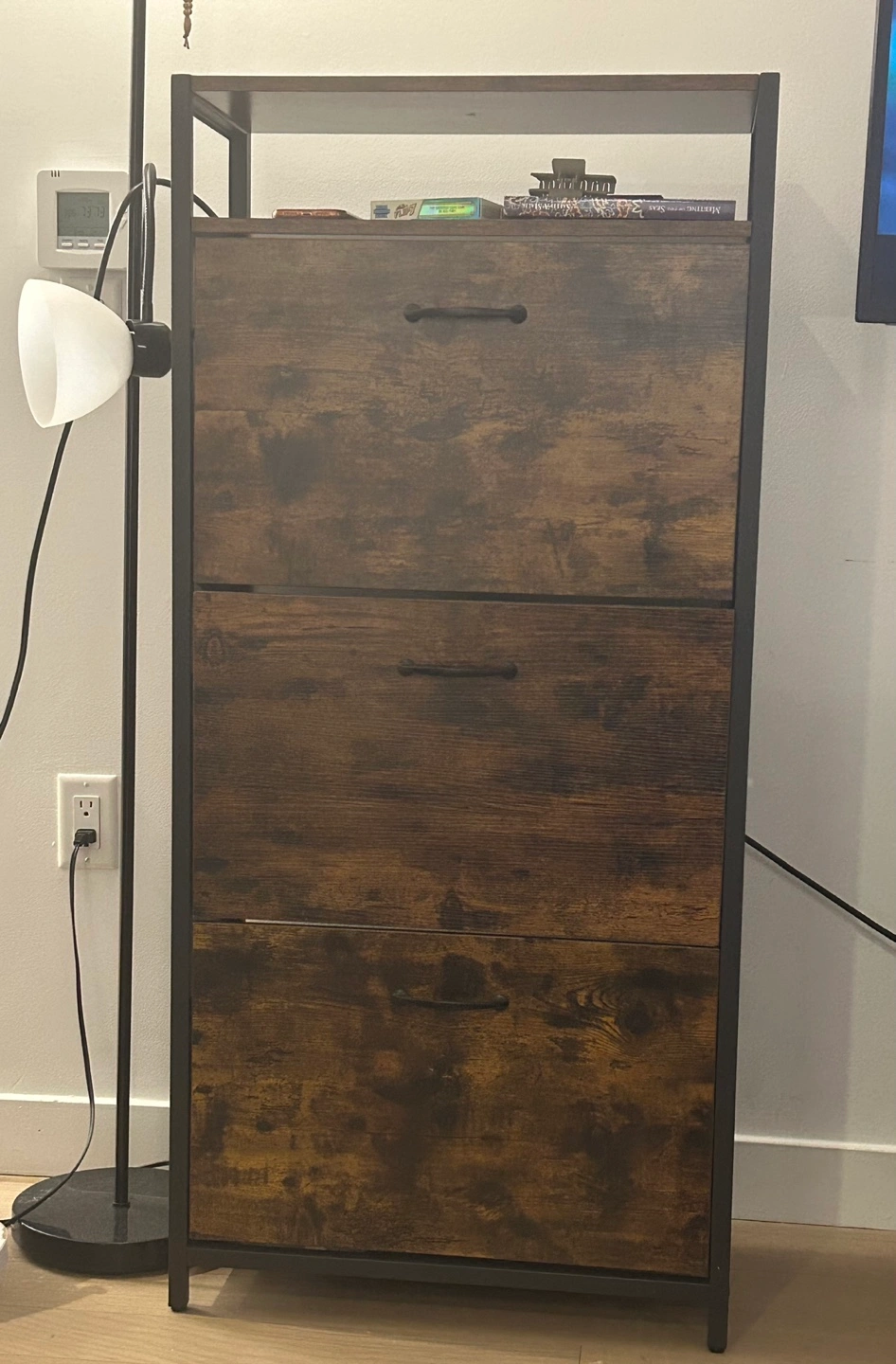 Like-new rustic brown industrial design shoe storage cabinet already assembled and perfect for keeping your entryway or closet organized!
