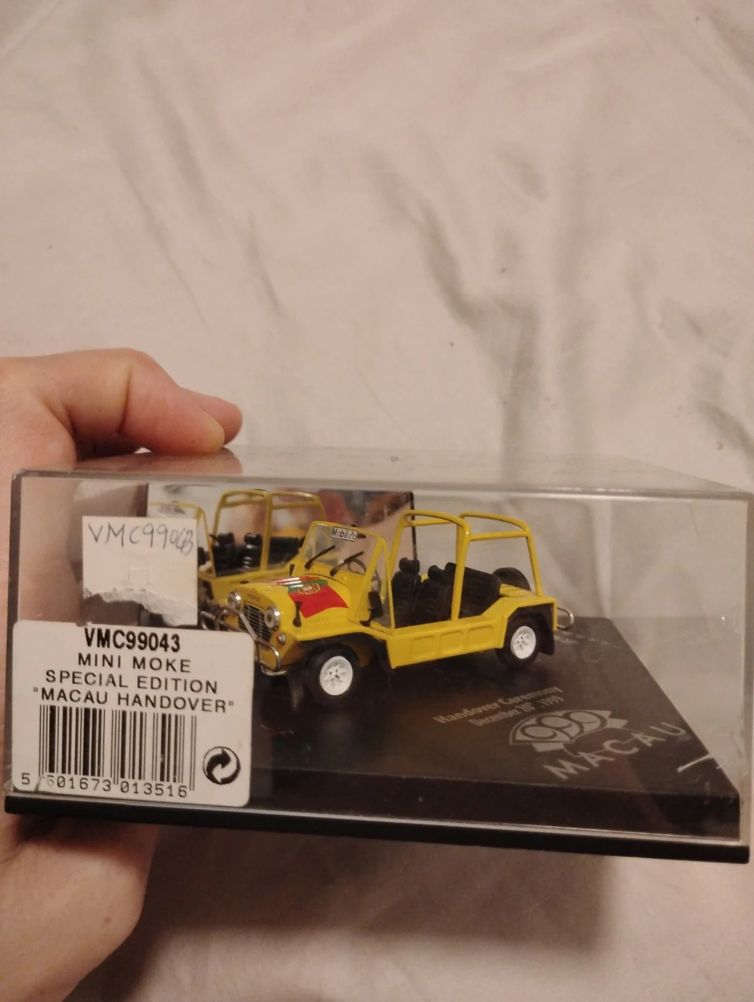 Selling a Vitesse Mini Moke Special Edition "Macau Handover" diecast car. It's an exact scale ornamental model for adult collectors. This model commemorates the Handover Ceremony on December 20, 1999