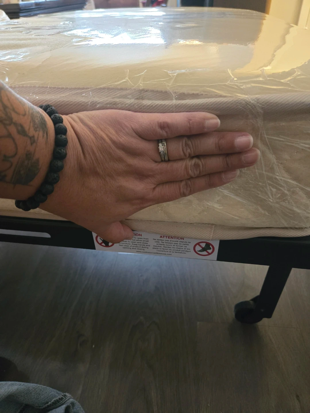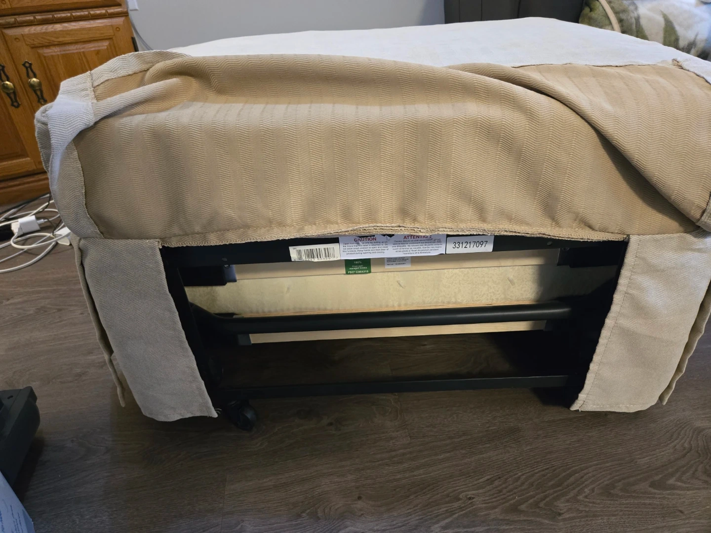 This convertible ottoman bed is perfect for small spaces. It easily converts from an ottoman to a bed, making it great for guests or for use in a studio apartment. The beige colour is neutral and will fit in with any decor. The bed frame is metal.